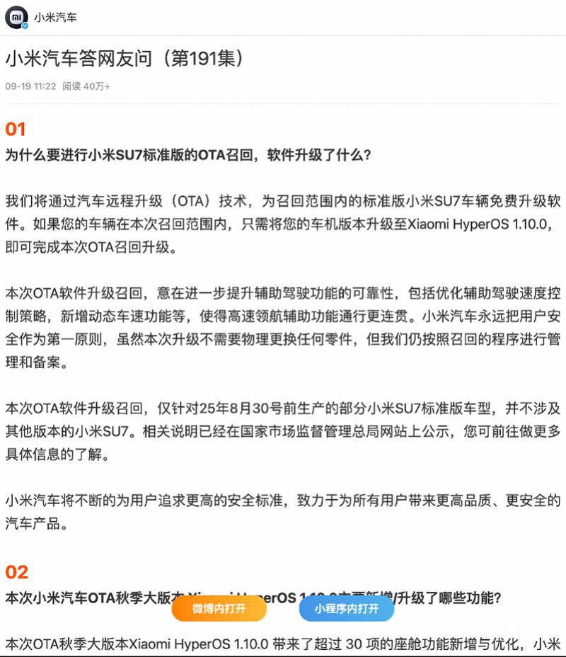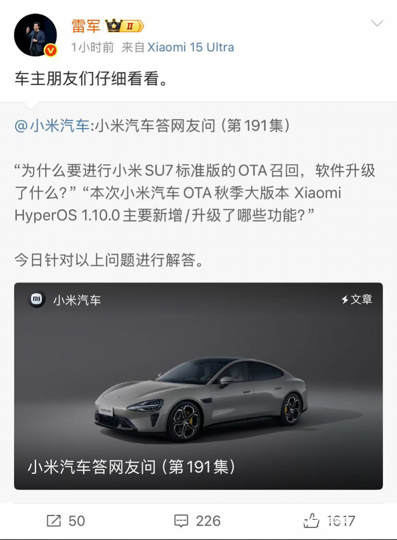 该博文提到, “本次OTA软件升级召回,意在进一步提升辅助驾驶功能的可靠性,包括优化辅助驾驶速度控制策略,新增动态车速功能等,使得高速领航辅助功能通行更连贯。小米汽车永远把用户安全作为第一原则,虽然本次升级不需要物理更换任何零件,但我们仍按照召回的程序进行管理和备案。”