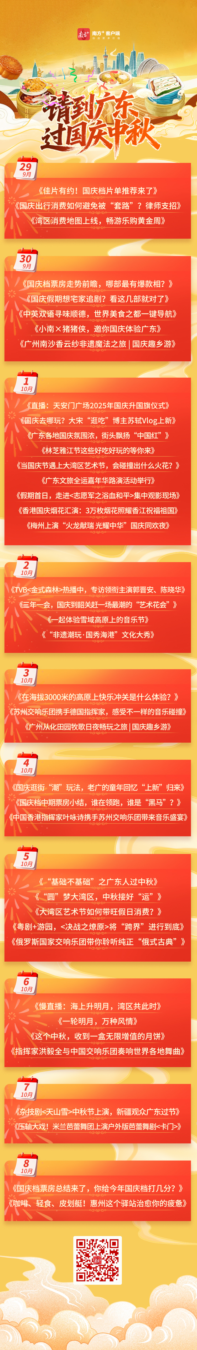 国庆连中秋,在“+”过佳节!8天长假即将到来,你打算怎么度过?这个假期南方+精心准备了2025国庆中秋节目单好戏轮番上演,共度“+”好“粤”圆转发收藏↓↓↓文案:陈明诗设计:郑炜良 南方日报、南方+客户端原创,未经授权不得转载 编辑 陈明诗校对 吴荆子 订阅后可查看全文(剩余80%)