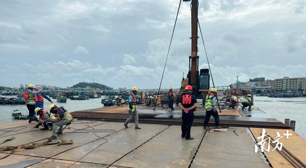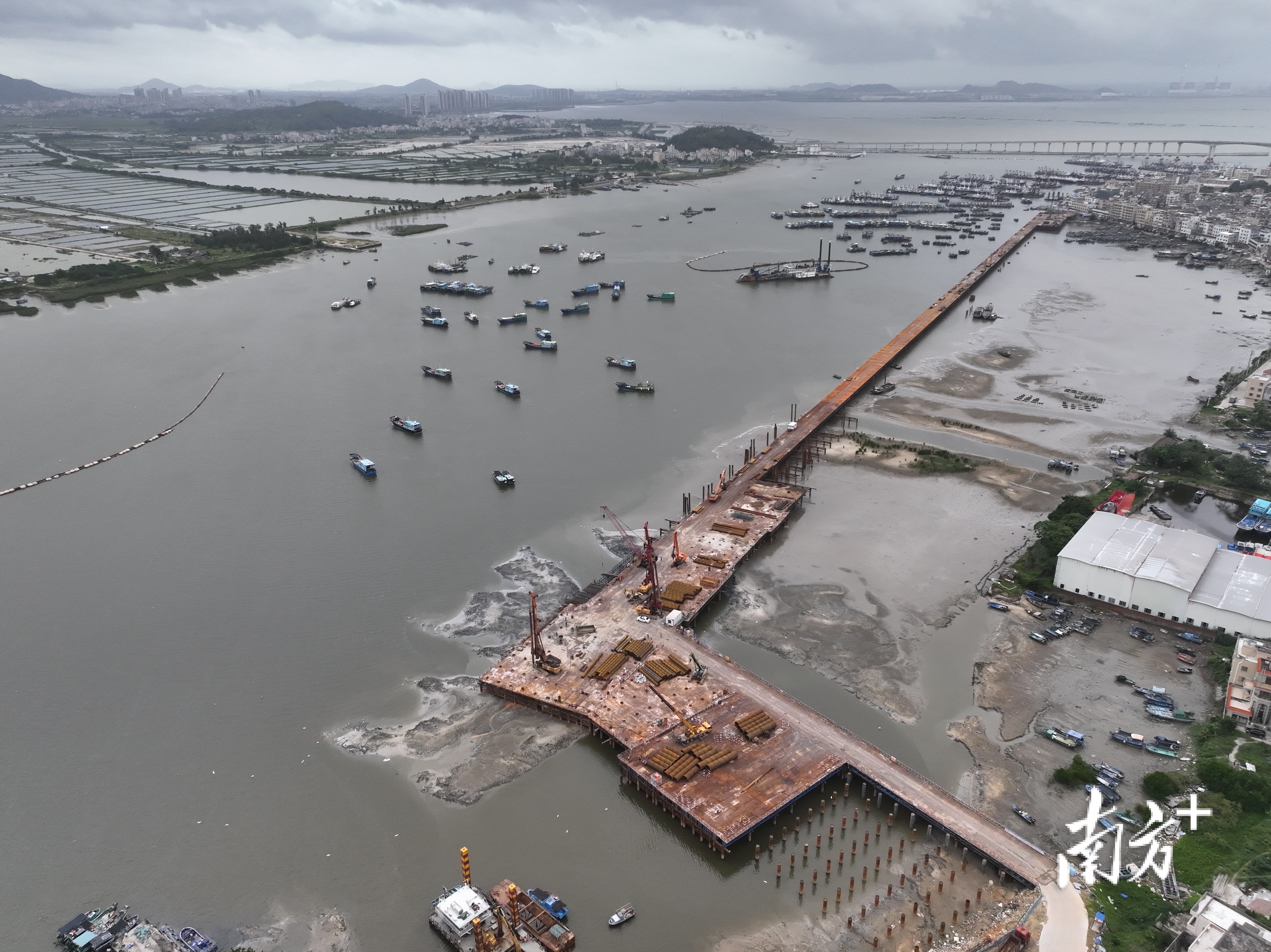 茂名博贺渔港经济区一期工程码头主栈桥钢平台合龙。