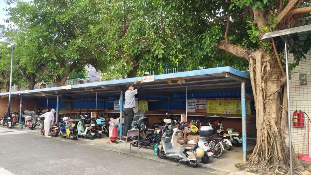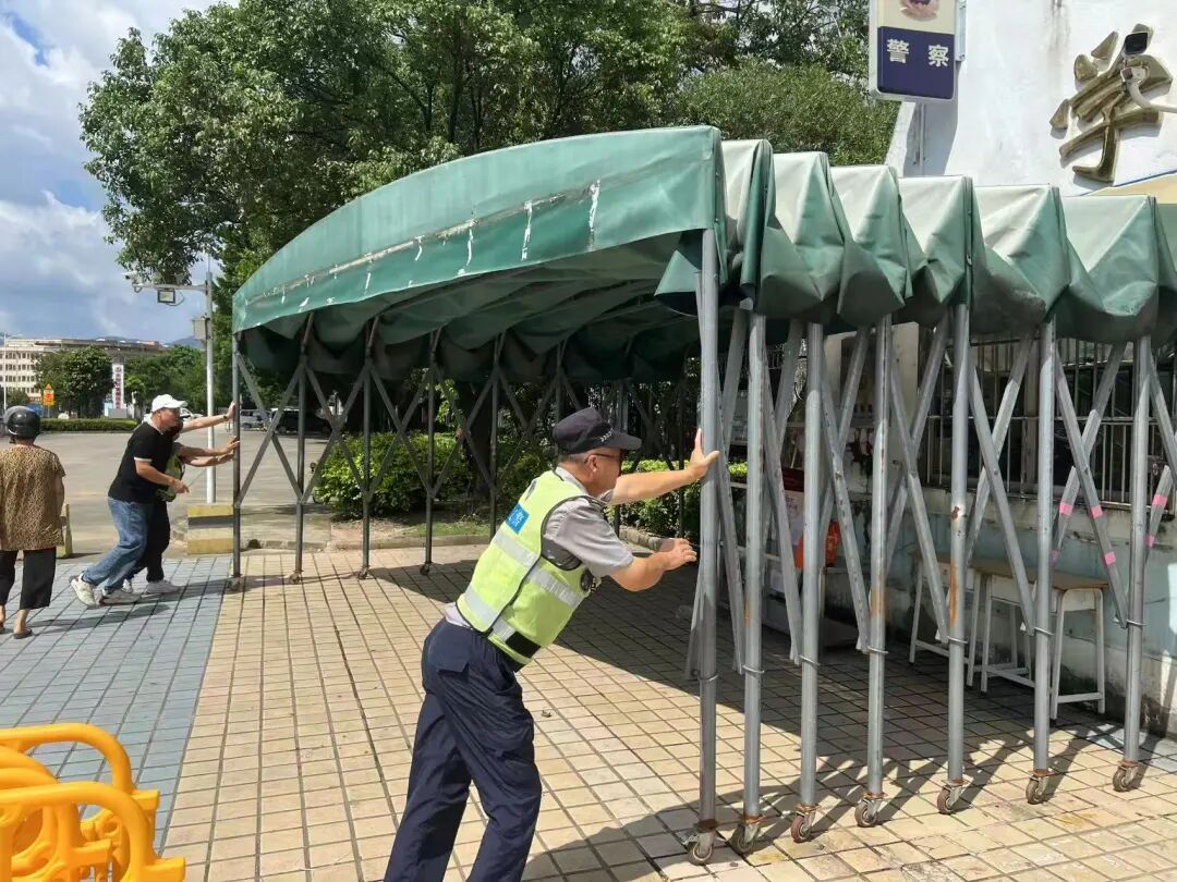 9月22日,清溪镇第二小学深入检查校内下水道通畅情况,清理淤积杂物,对校园内的遮阳棚进行全面收拢与稳固固定,防止强风导致设施脱落、损毁,并同步回收校门外的水马及宣传架等可移动设备,避免台风过境时造成物体坠落或位移伤人。