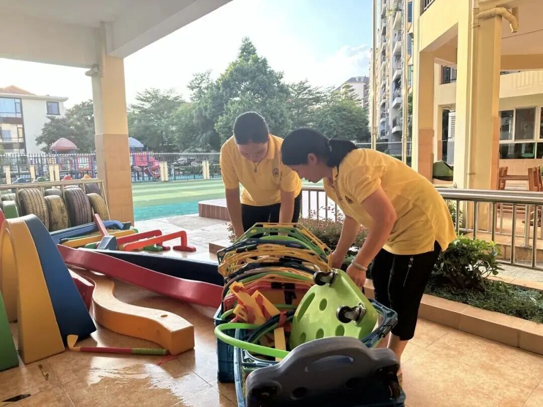松山湖各学校、幼儿园迅速采取多项措施全面强化防御,全面检查排水系统,加固门窗和户外设施,清理屋顶杂物;储备应急物资,成立应急小组,落实24小时值班制度;通过班级群、校园通知等途径向师生和家长发布安全提示,做好停课期间居家防护指导。