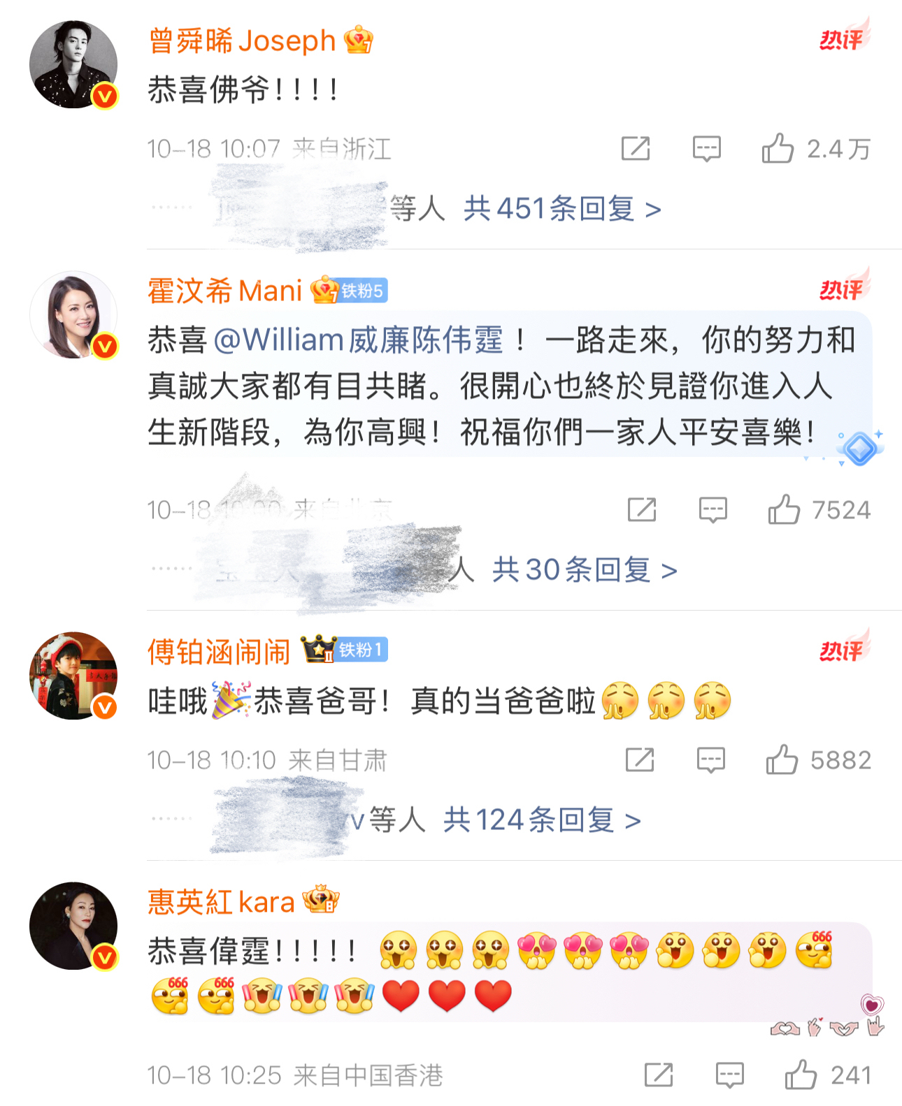 陈伟霆和何穗官宣生子后,霍汶希、曾舜晞、惠英红等不少圈内好友以及两人粉丝都送上了祝福。最近在《许我耀眼》中扮演陈伟霆儿子的小演员傅铂涵也幽默祝福道:“恭喜爸哥!真的当爸爸啦!”还有网友评论两人恋情低调,“闷声干大事!”