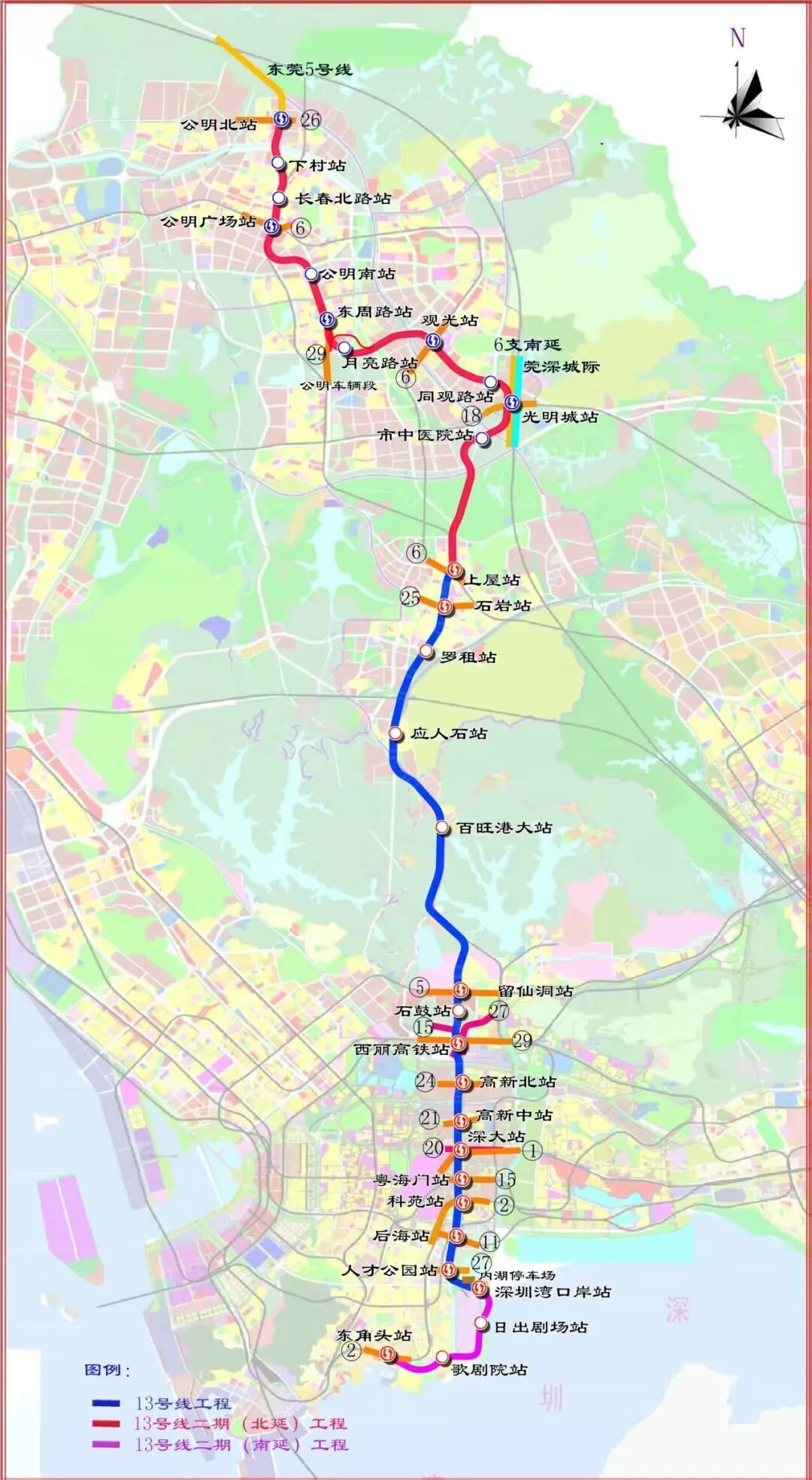 13号线一期北段设9个地铁站,连接西丽综合交通枢纽、留仙洞总部基地以及石岩片区。据悉,西丽综合交通枢纽工程涉及城市轨道交通工程、枢纽配套工程、市政工程、枢纽内相关开发配套工程等,因配合西丽综合交通枢纽工程交叉建设,13号线西丽高铁站在年内线路开通运营时暂不具备开通条件。