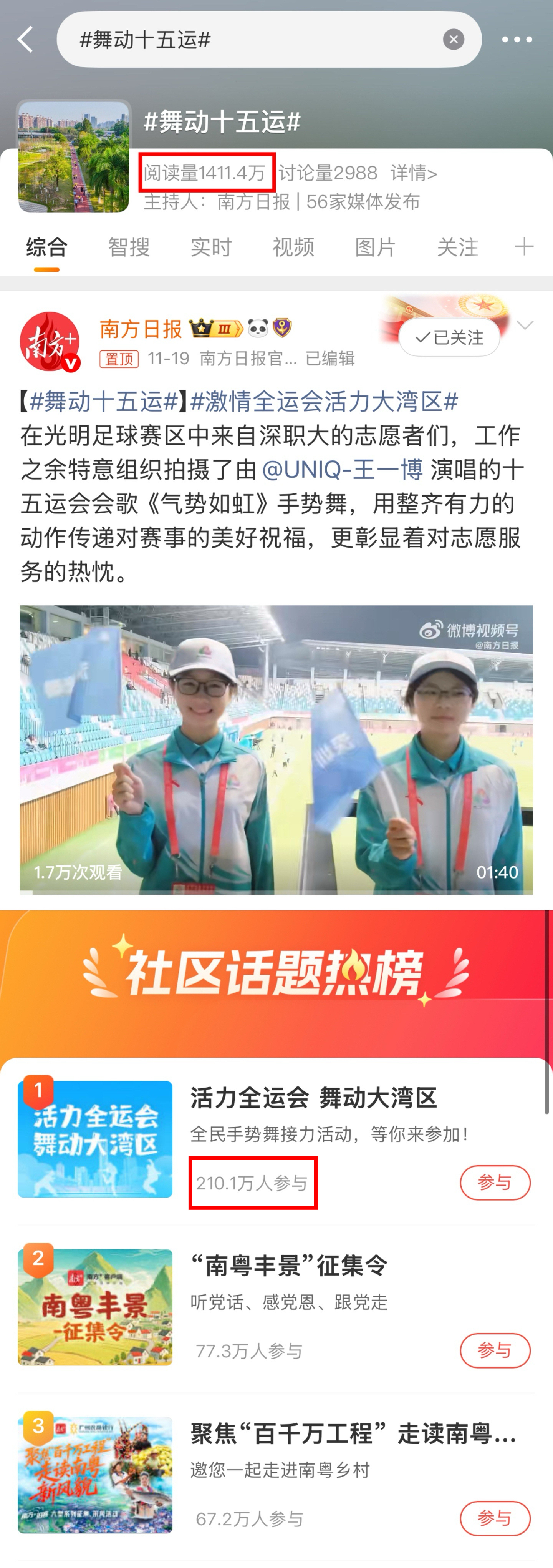 截至目前,南方+话题页总点击量超200万,登上南方拍客活动阅读量榜首;微博话题阅读量超1400万,客户端征集作品近400份,超百万人次参与线上线下舞动接力活动,形成传播热潮。