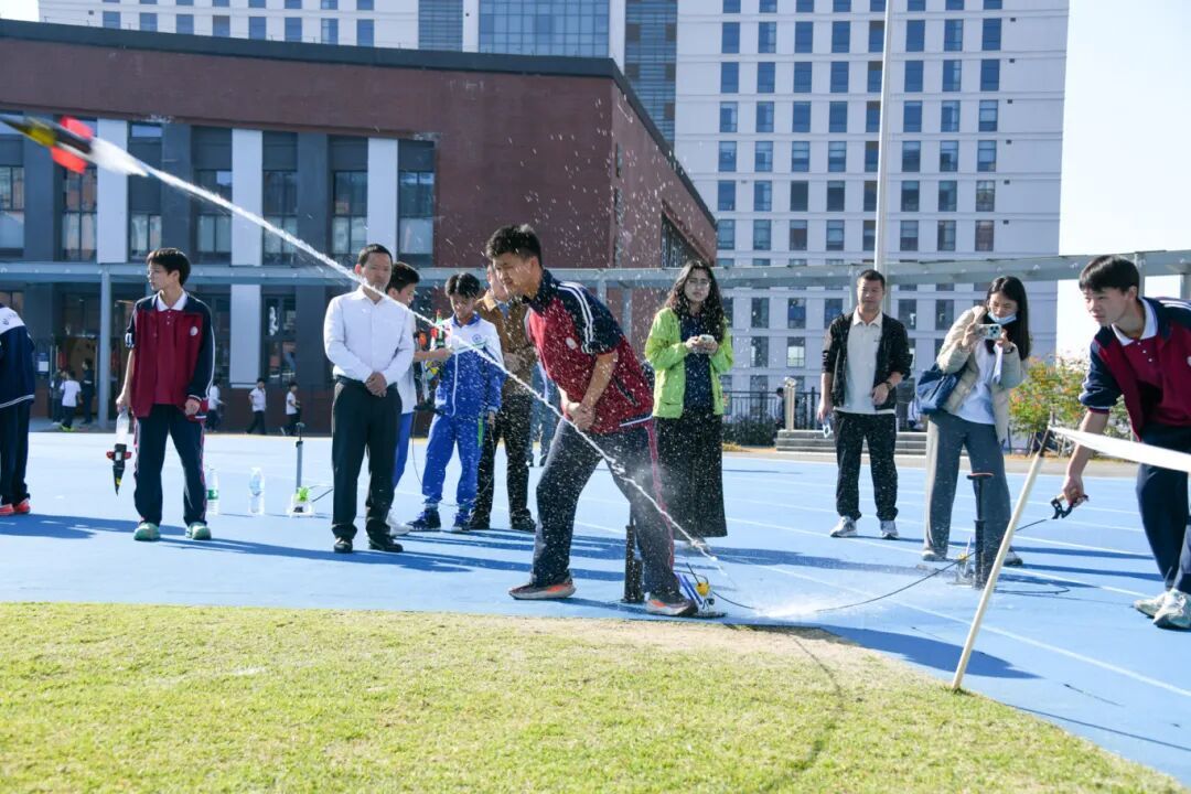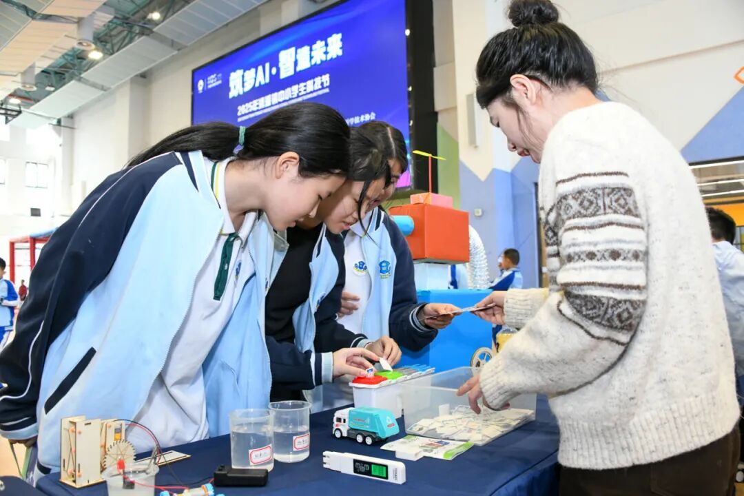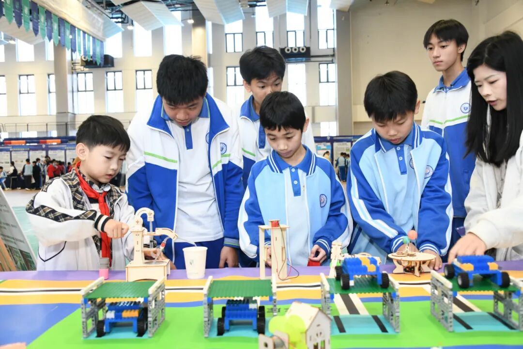 在学校体育馆与足球场上,中小学生科技创新运动会、人工智能现场制作比赛同步进行。科技创新运动会分小学、初中组,设有纸箭飞梭、铁丝陀螺、水火箭打靶、攻城投石车、橡皮动力飞机等项目;人工智能现场主题制作比赛则从思想性、科学性、创新性、实用性等多维度对作品进行评审。两项赛事均展现了学生的动手能力与创造性思维,进一步激发了他们对科技的热爱与探索热情。