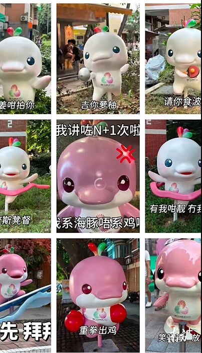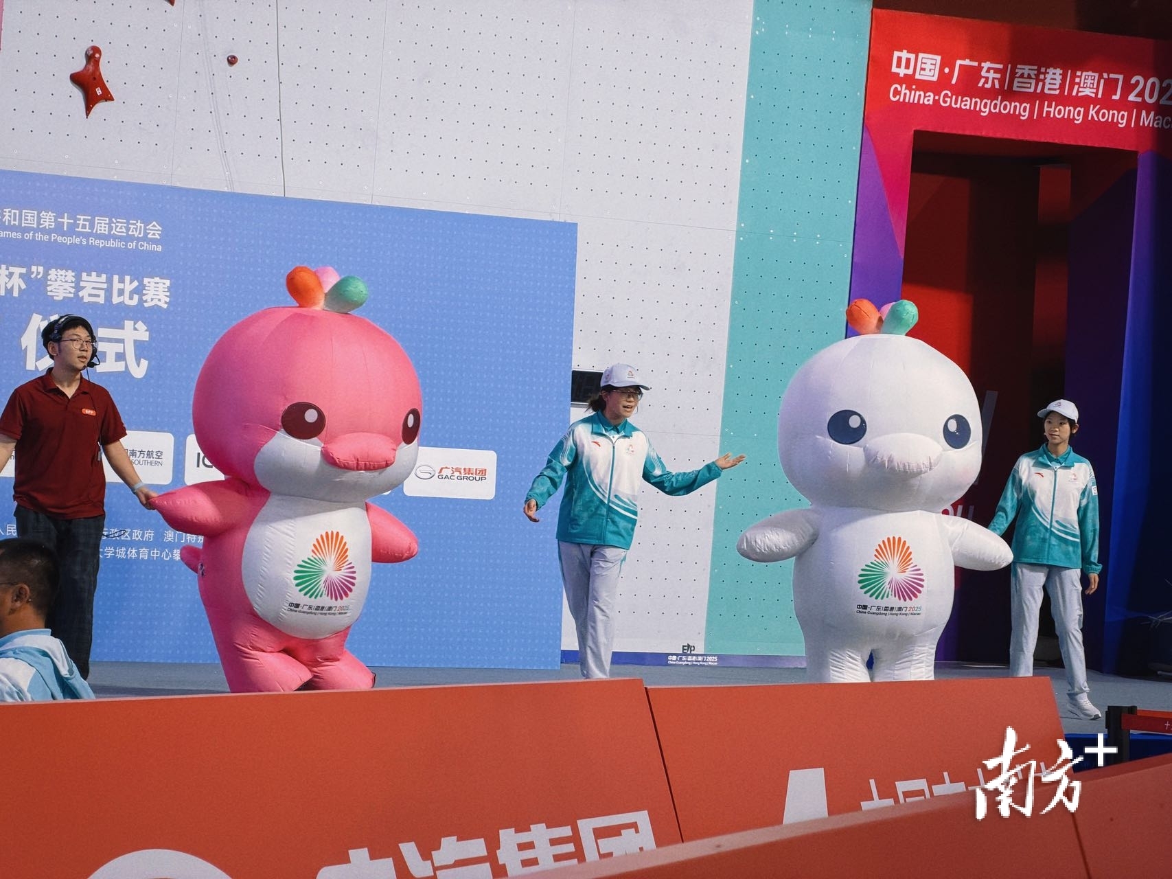 每场赛事,伴随着熟悉的背景音乐出场的可爱吉祥物。图为攀岩赛事中和观众互动的喜洋洋和乐融融。 《南方》杂志记者影子 拍摄