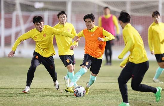 3月24日晚,国足在天津奥体中心外场备战26日晚与新加坡队主场世预赛36强赛,韦世豪(中)身穿“首发背心”。视觉中国供图