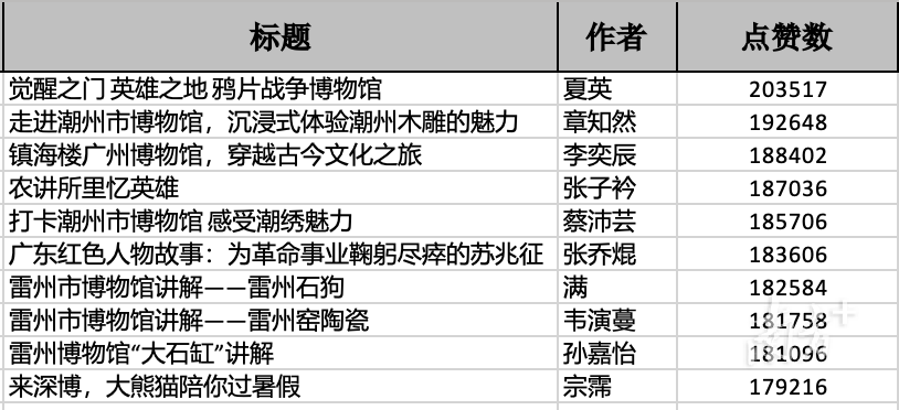 其中,投稿作者最喜爱的博物馆包括广东省博物馆、南越王博物院、广州农讲所、广州海事博物馆、潮州市博物馆、中共三大会址纪念馆、广东民间工艺博物馆等。