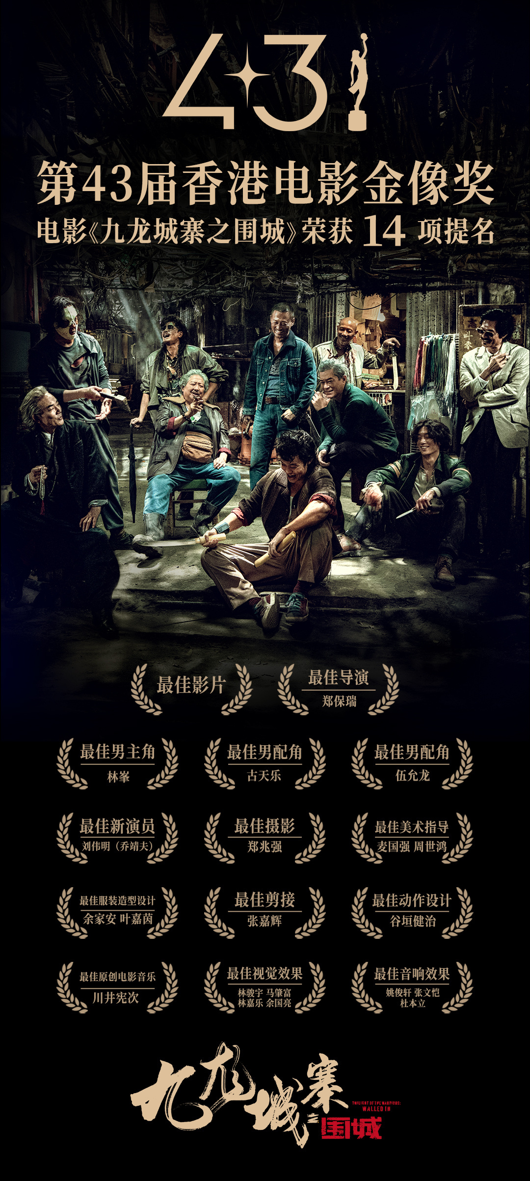 《九龙城寨之围城》紧随其后,入围最佳影片、最佳导演、最佳男主角、最佳男配角(提名2人)、最佳新演员等13个奖项,共获14项提名。