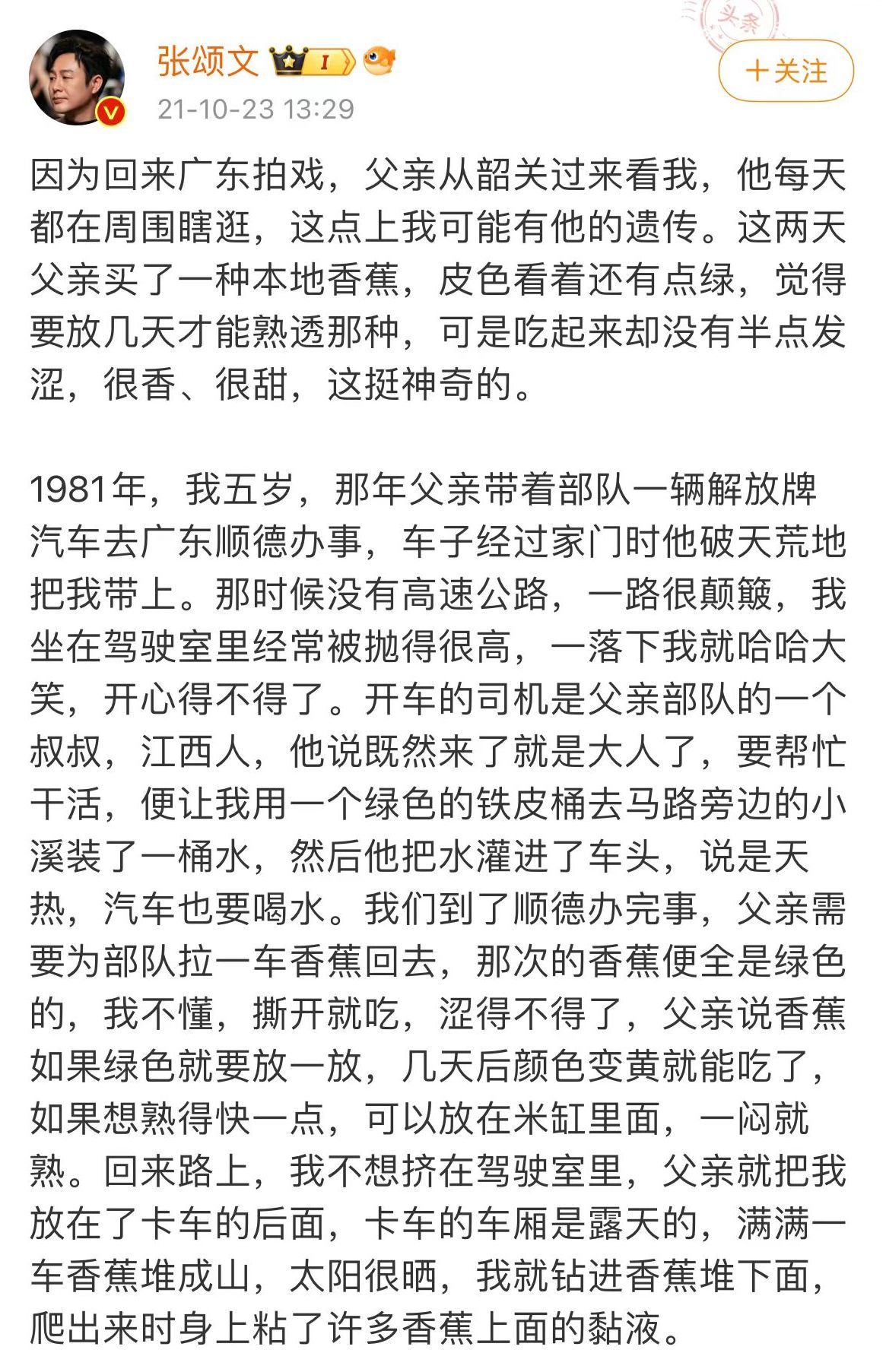 小时候,张颂文陪父亲一起去顺德,看到绿色的香蕉,他扒开皮就吃,结果被涩得不行。