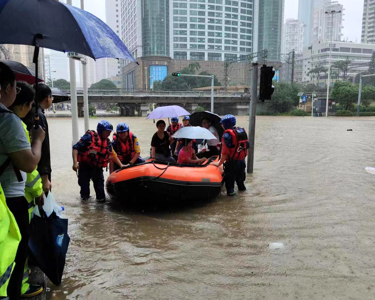 9月8日,从河源赶来的蓝天救援队救援人员在深圳市罗湖区友谊商业大厦附近转移被困市民。图源:新华社