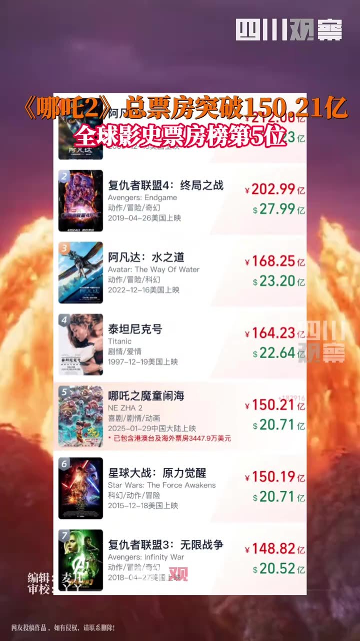全球第五!3月15日,《哪吒2》总票房超越《星球大战7》位列全球影史票房榜第五位!