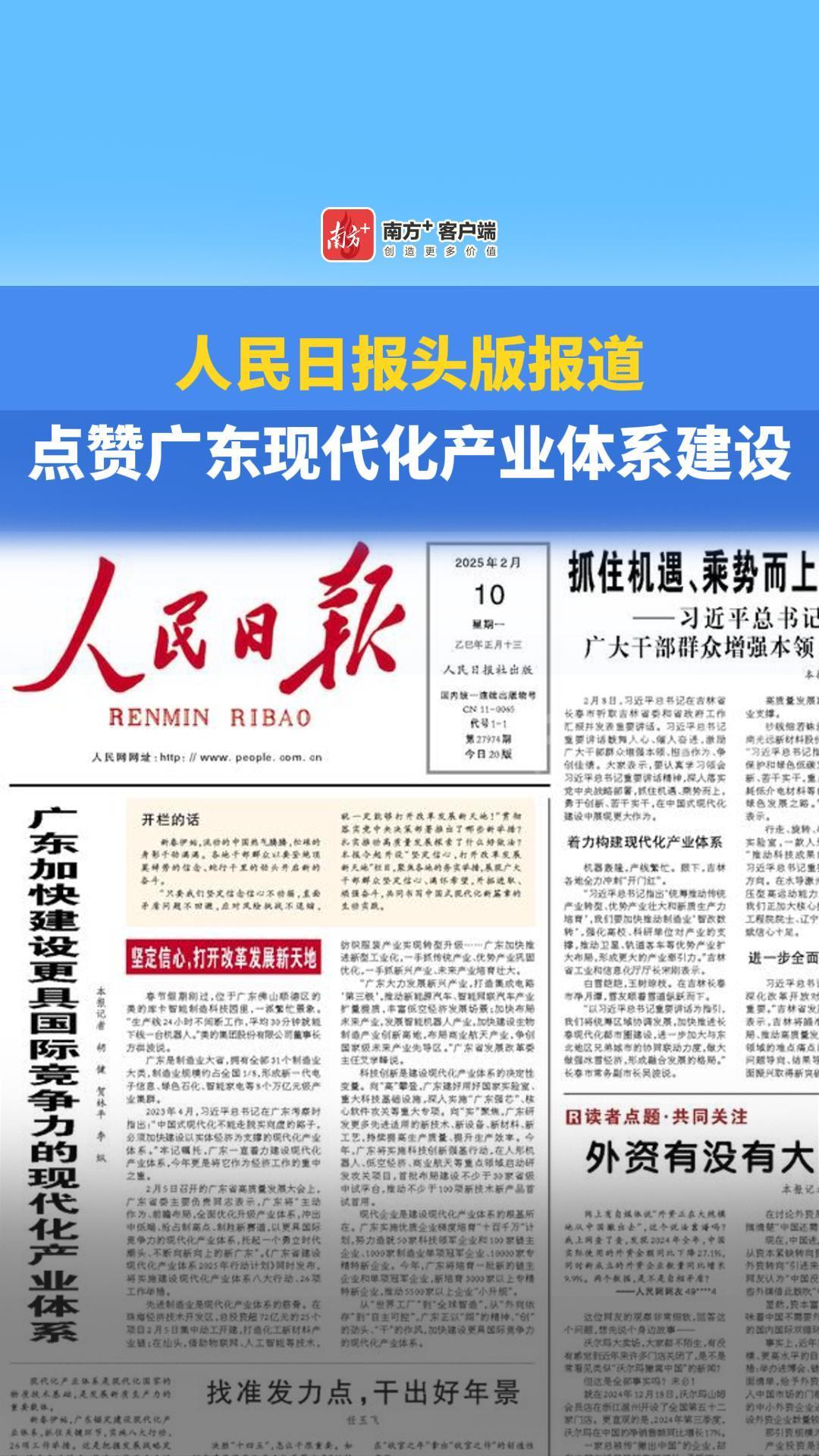 2月10日,《人民日报》头版刊发报道《广东加快建设更具国际竞争力的现代化产业体系》。