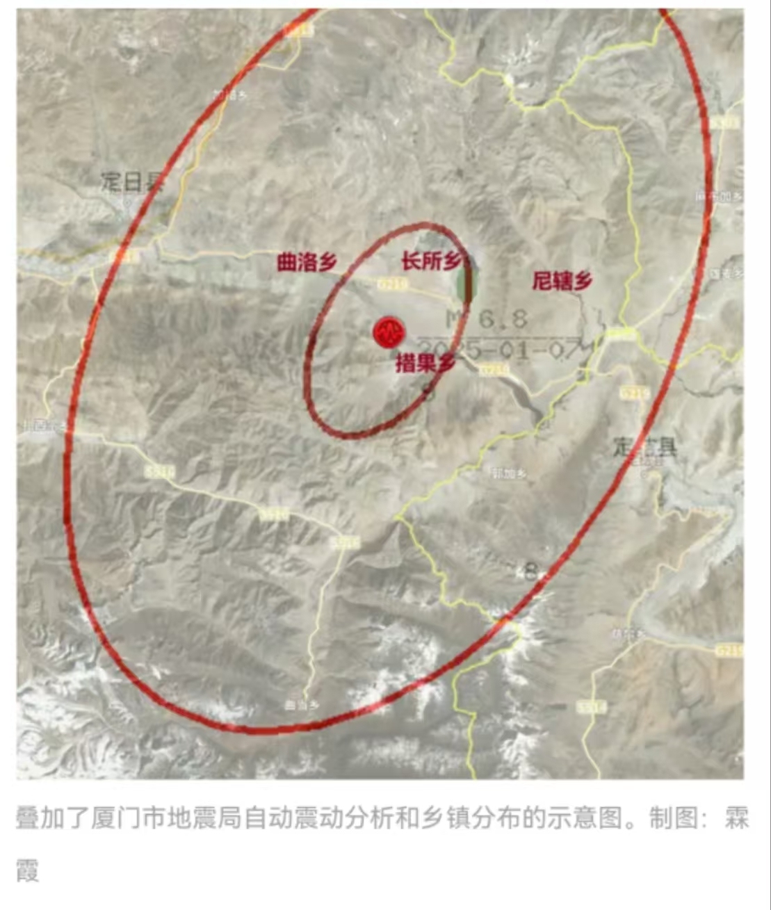 相比定日县城,更靠近震中的措果乡、长所乡、曲洛乡在地震中受灾更为严重,大量房屋倒塌。长所乡嘎布村一村民告诉媒体,该村有多人遇难,都是中年人,还有人被坍塌的房子砸到头、腰,受伤严重。