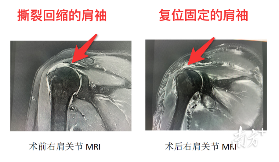 云浮市人民医院骨科一区陈桂全主任医师及南方医科大学南方医院博士、驻点专家程豪了解情况后,对王女士进行详细查体及完善MRI(磁共振)检查,确诊其为“右肩袖巨大撕裂(长涉及2根以上肌腱,撕裂范围大于5厘米)”,撕裂肌腱回缩明显。