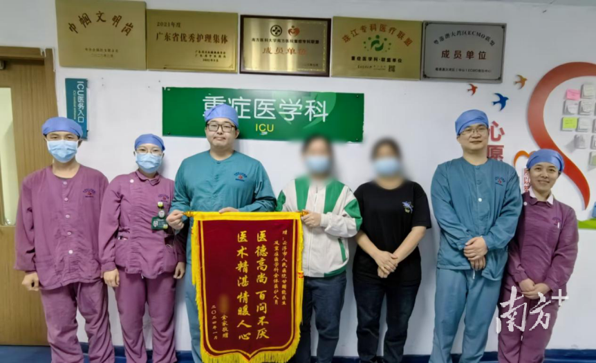 锋转出ICU前我们一起留影纪念。出院前,他为我们送来锦旗,并通过微信让管床医生转达对我们的感激之情。