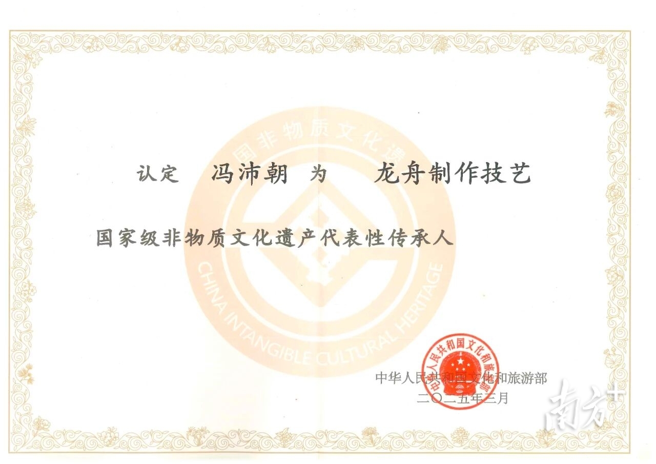 近日,在东莞市第六批国家级非遗代表性传承人颁牌仪式暨2025年非遗第二期培训班开班仪式上,东莞市文化馆为第六批国家级非遗代表性传承人授牌并颁发证书,其中“龙舟制作技艺”传承人冯沛朝,获颁国家级非遗代表性传承人证书。