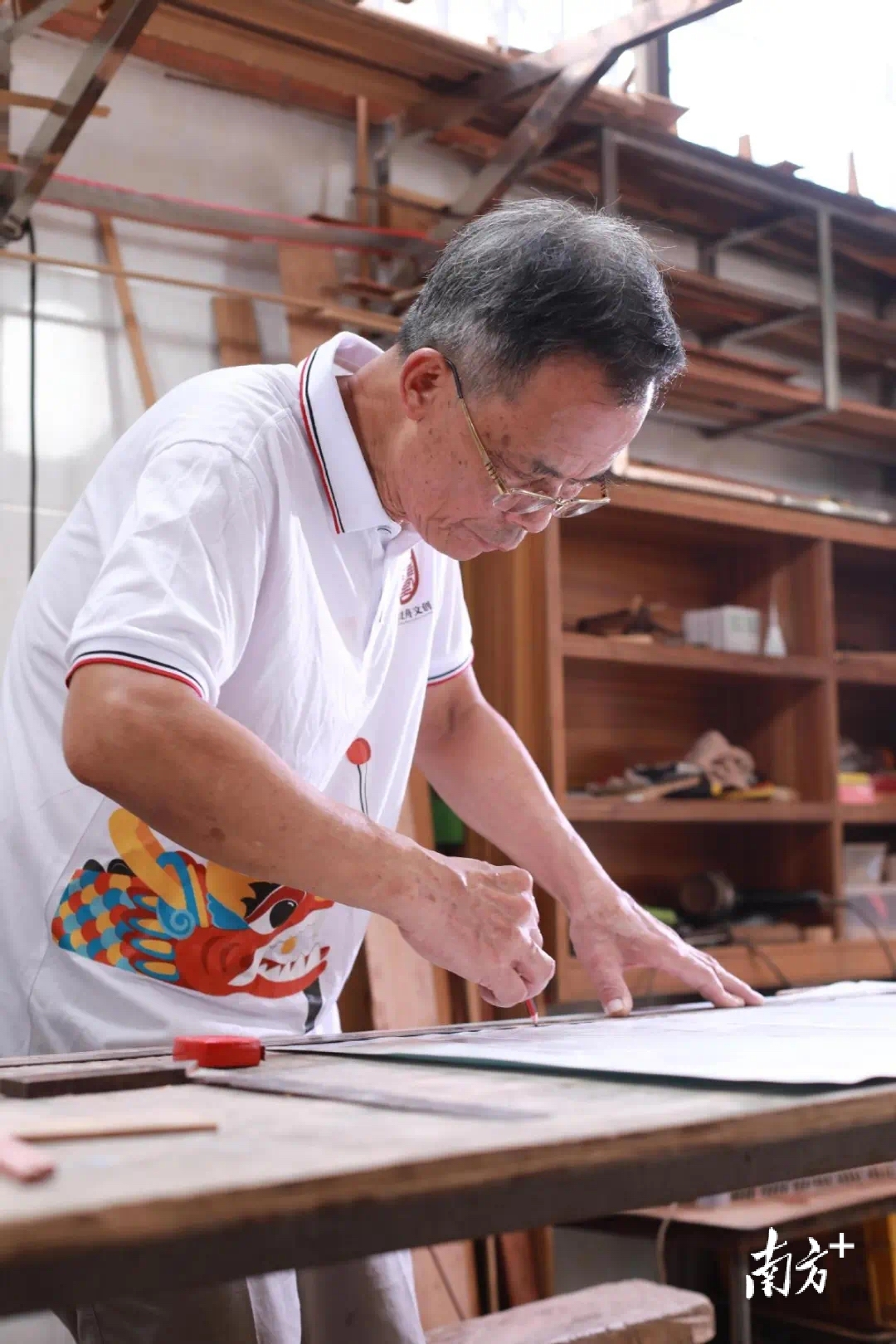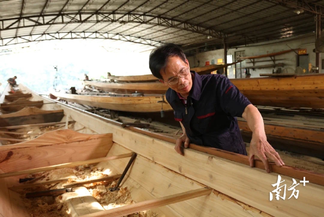 从选料、做底骨、钉蝴蝶底、反底起水、钉转水旁、做花旁、做大旁、安龙肠、上桐油灰到安龙头龙尾,冯沛朝独立执尺,掌握了100多道完整工序,贯穿其中的弹墨斗线更是其“绝活”,技术娴熟,力度得当,弹线匀速,笔直而准确,如今在中堂的龙舟制作中鲜少有人掌握。