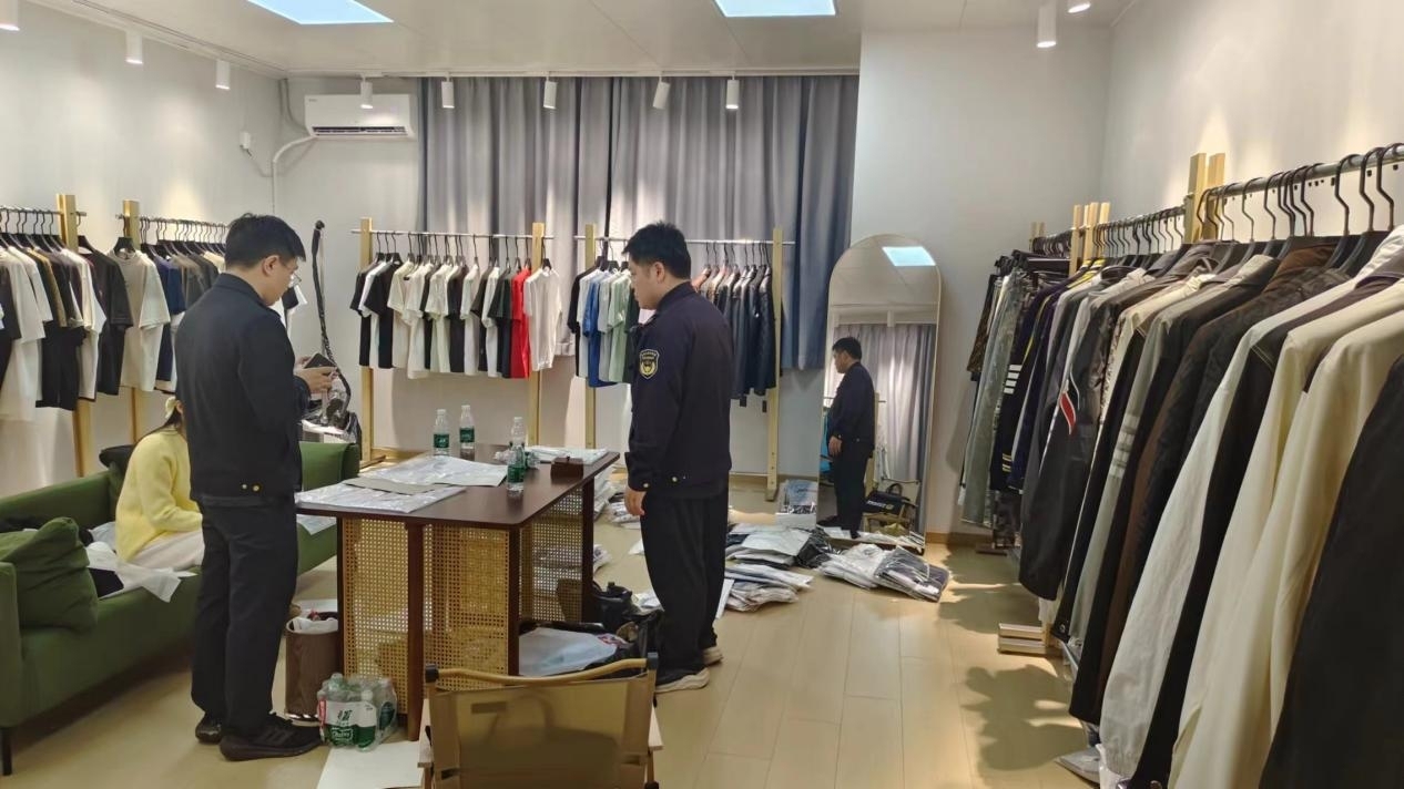 同样在深夜,执法人员发现一违法团伙通过拉客引流,将消费者诱骗至隐蔽展厅销售侵权服装。现场,当事人无法提供合法授权证明,执法人员依法扣押涉假物品,并对该窝点进行立案查处。