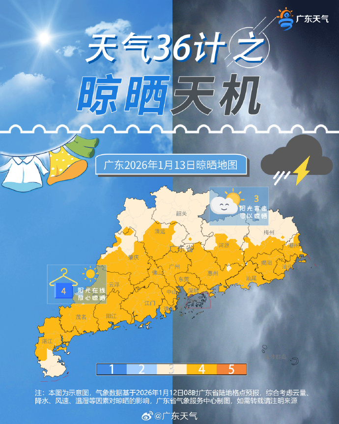 13日,广东全省大部多云到晴天,粤西市县早晚有(轻)雾。