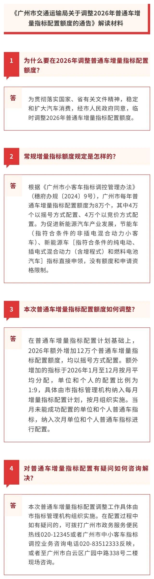 据了解,本次调整2026年普通车增量指标配置额度,是贯彻落实国家、省关于提振消费专项行动方案相关要求的具体举措,进一步稳定和扩大广州汽车消费。相关措施实施后,2026年普通车增量指标增加12万个。