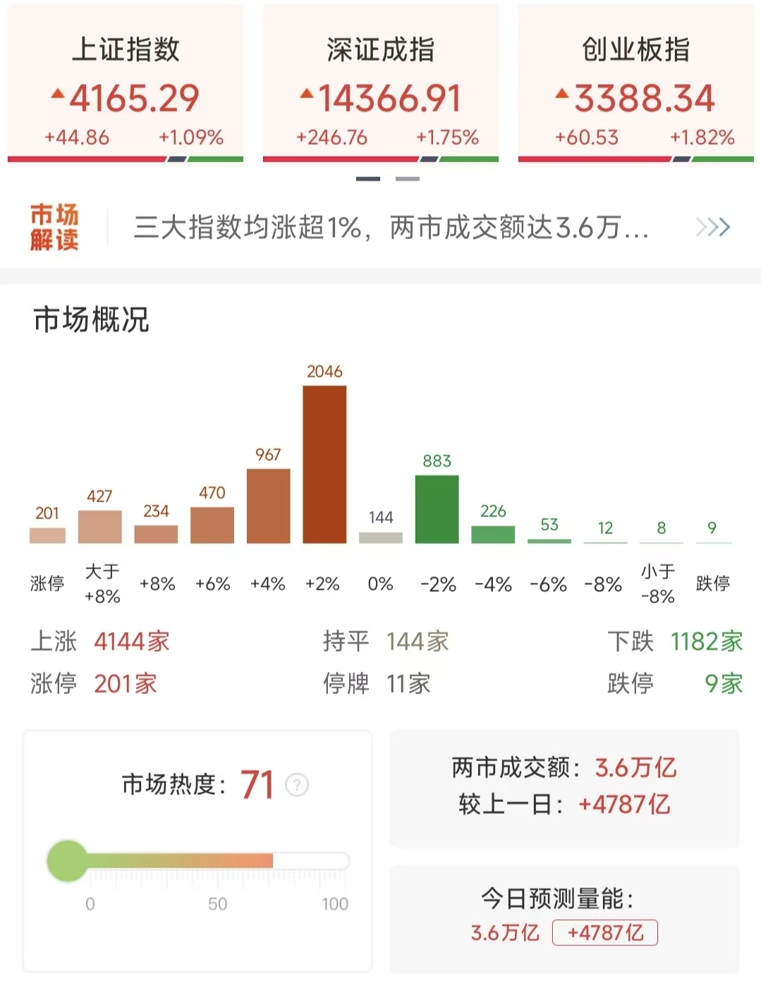 截至收盘,三大股指涨超1%。其中,沪指报4165.29,涨1.09%,再创新高;深成指涨1.75%,创业板指走出“V”字反弹,涨1.82%。此外,北证50大涨5.35%,科创综指涨2.88%,中证1000涨2.8%。