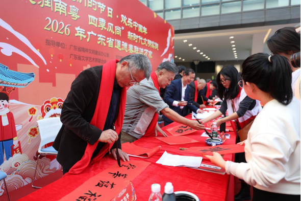 乡村大舞台上,歌舞、戏曲、本土特色节目轮番登场,用接地气的表演传递新春喜悦;挥毫送福区,文艺志愿者、书画家纷纷拿起毛笔蘸取墨汁,一幅幅红彤彤的春联与“福”字在他们笔下诞生,墨迹未干便被村民小心接过……1月17日,“粤美村晚”迎新春——肇庆市文艺志愿服务“百千万工程”暨2026年道德春联进万家送“福”文艺惠民活动在广宁县排沙镇蚌溪村热闹开演,为村民送上一份热气腾腾的文化大餐,也搭建起一座邻里守望的“连心桥”。