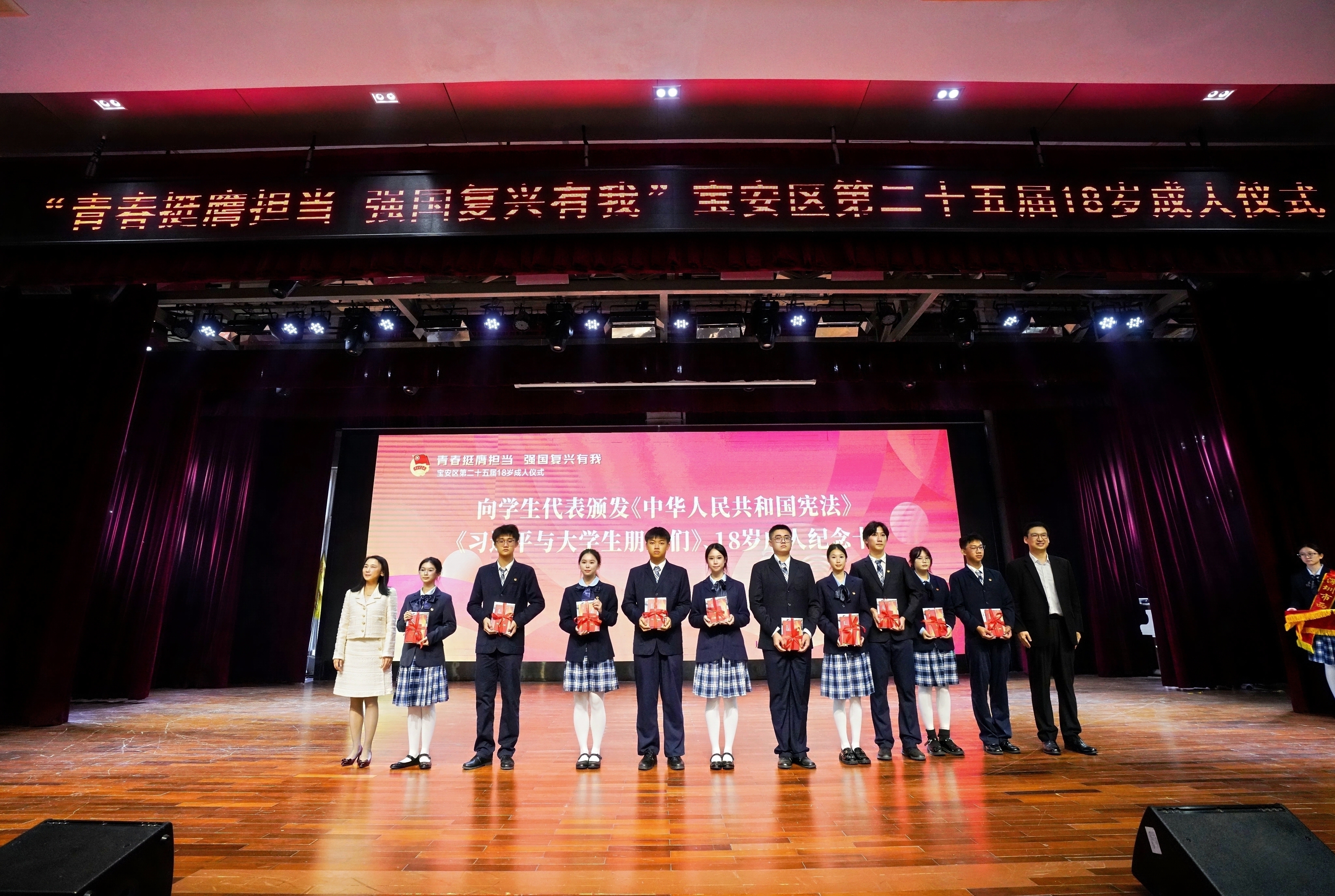为深入学习宣传贯彻党的二十届四中全会精神,引导适龄青少年树立成人意识,增强爱国意识、公民意识、宪法和法律意识、责任意识、感恩意识。12月18日,团区委、区教育局、区关工委、区文明办在前海未来教育集团西乡中学高中部联合举行“青春挺膺担当,强国复兴有我”宝安区第二十五届18岁成人仪式。