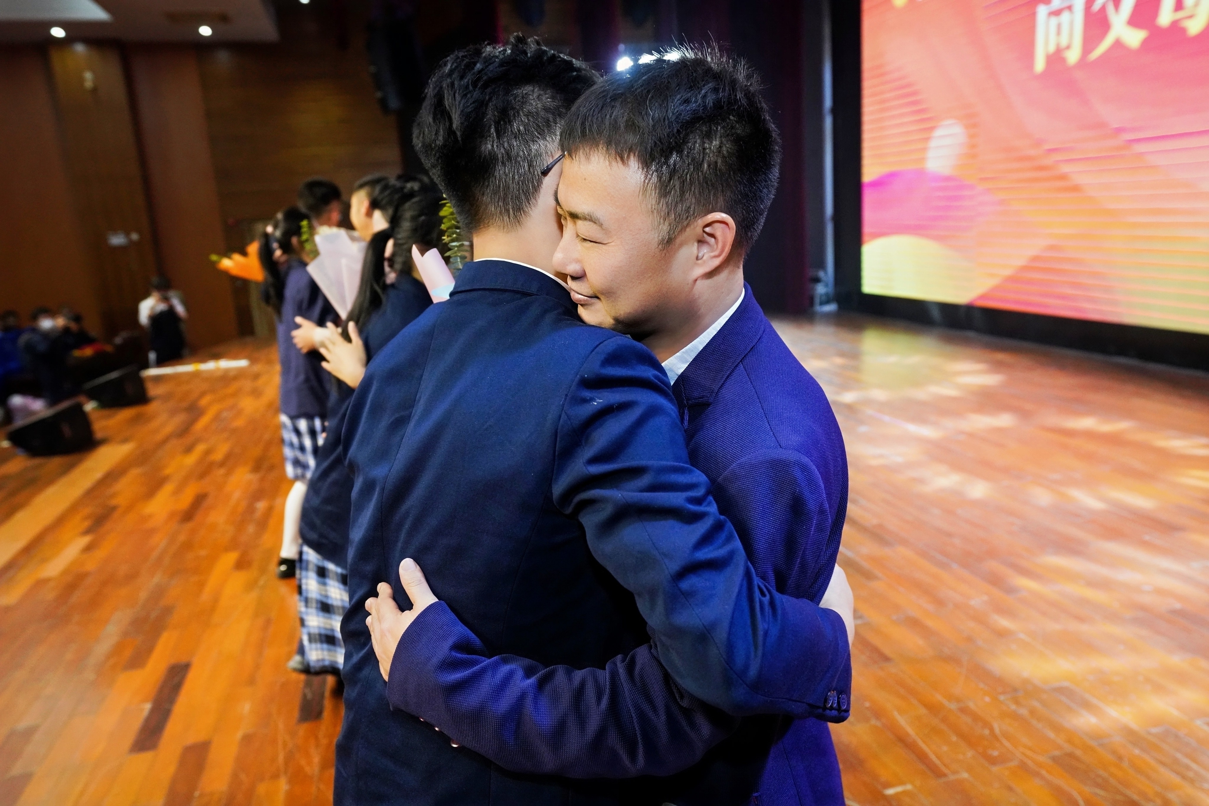 温情环节《爱的拥抱》中,亲子间的真挚告白与感恩礼感动全场,师生互赠鲜花则凝聚了三载教诲的深情。学生代表李淇琳誓言以拼搏回报青春,全体学子面向国旗庄严宣誓,并获赠《宪法》与成人纪念卡,标志着责任与使命的传递。最后,同学们携手跨越“成人门”,在心愿墙写下憧憬,以坚定步伐迈向未来。