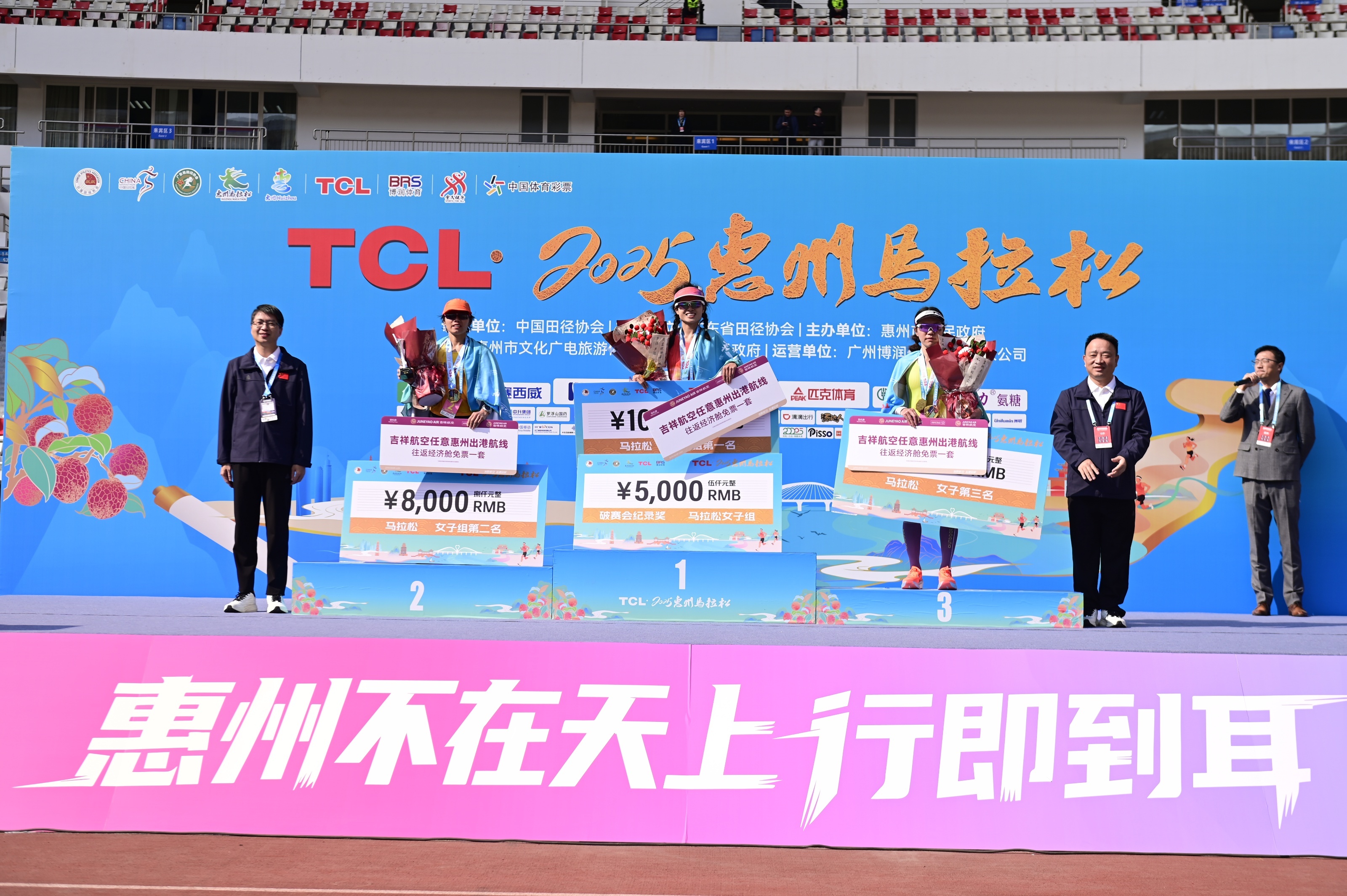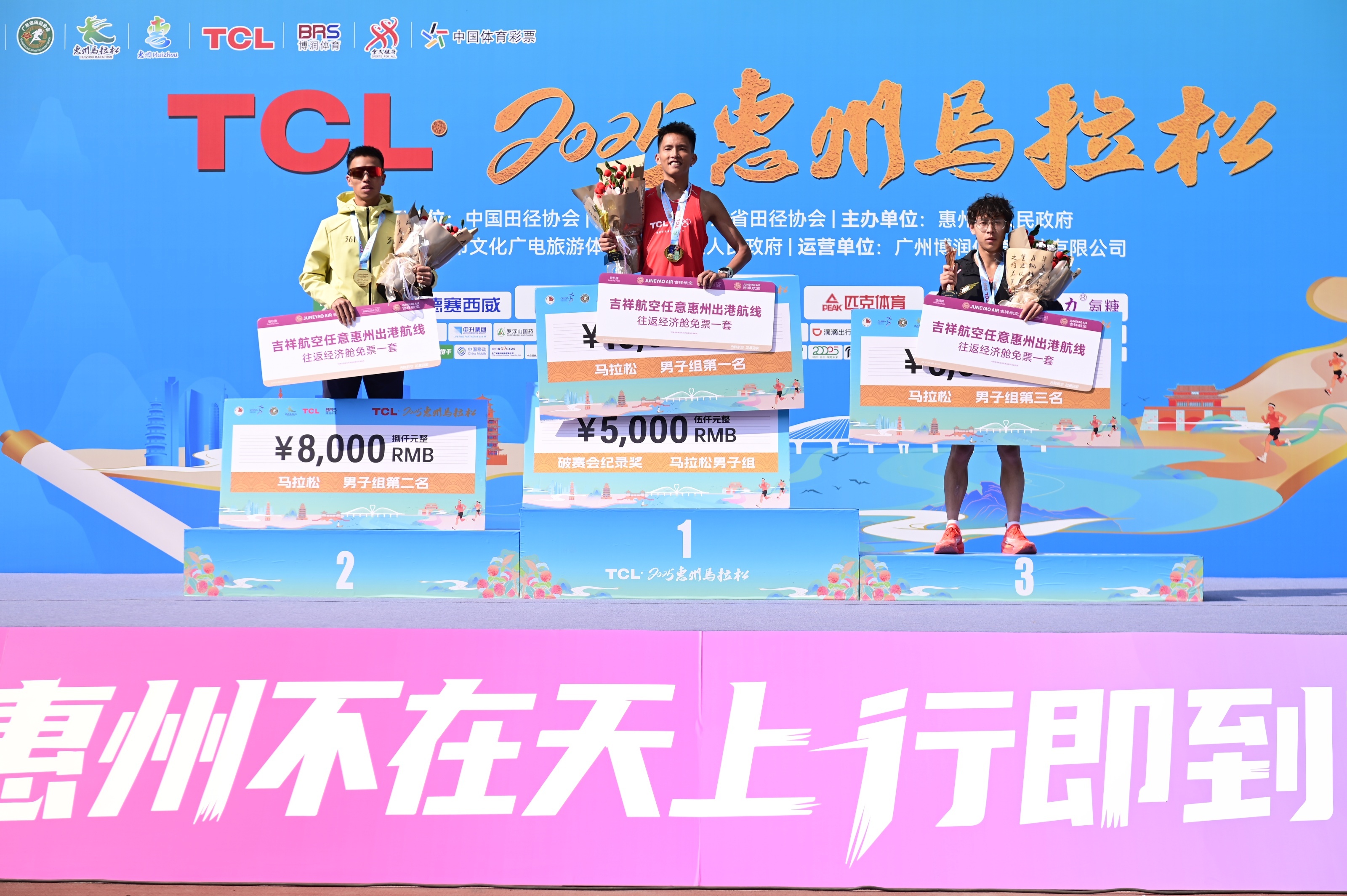 经过激烈角逐,广东惠州选手陈华威、佛山选手韦洁婷分别斩获全程马拉松男子组、女子组冠军,新疆伊犁选手叶拉斯·哈依拉提、广东清远选手陈丽琴分别斩获半程马拉松男子组、女子组冠军。