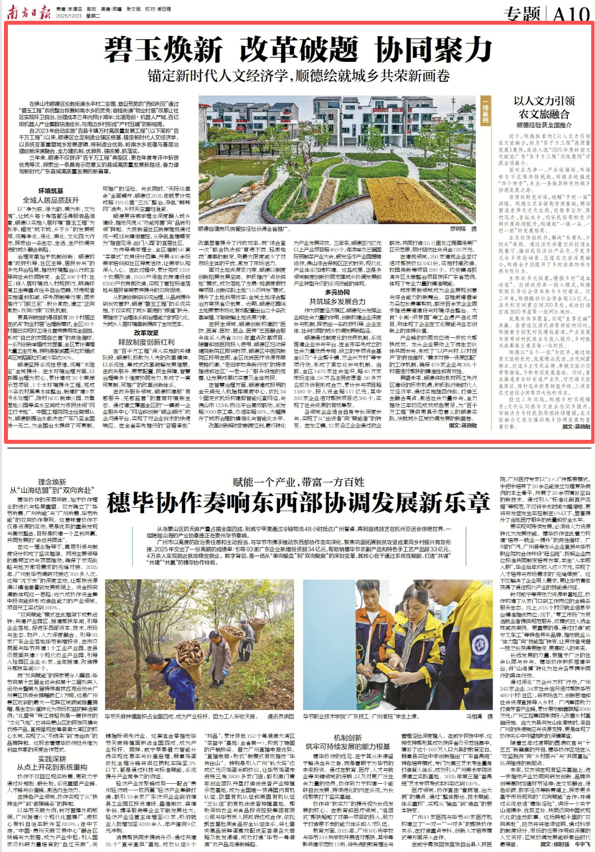 在佛山市顺德区伦教街道永丰村二安围,昔日荒芜的“西伯利亚”通过“碧玉工程”系统整治恢复岭南水乡的灵秀;容桂街道“物业村居”改革让社区实现环卫自治,治理成本三年内预计减半;北滘海创・机器人产城,百亿级机器人产业集群快速成长,与周边乡村形成“产村互哺”的新格局。