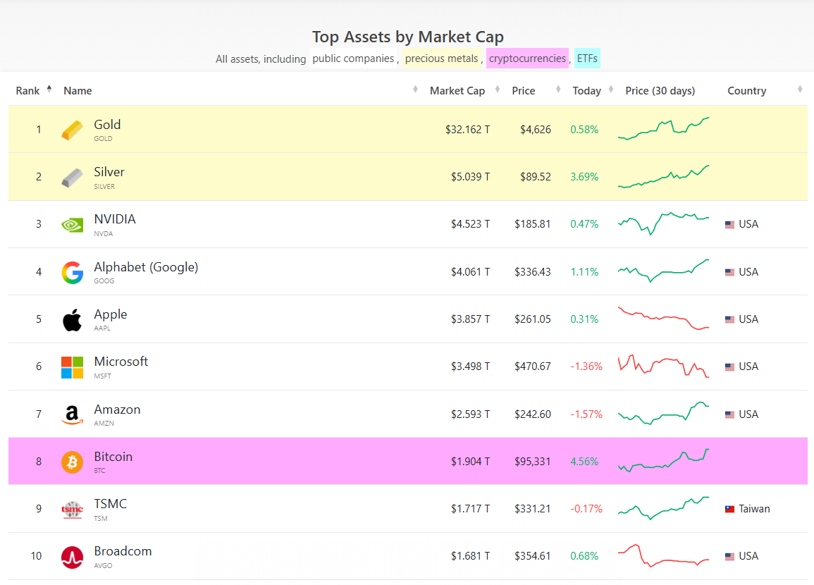 受银价提振,白银总市值首次站上5万亿美元大关,已超越英伟达成为全球第二大资产。根据市值数据平台CompaniesMarketCap的数据,目前白银市值为5.039万亿美元;黄金以32.162万亿美元的市值位居榜首,芯片巨头英伟达以4.523万亿美元的市值滑落至第三。前十名榜单如下: