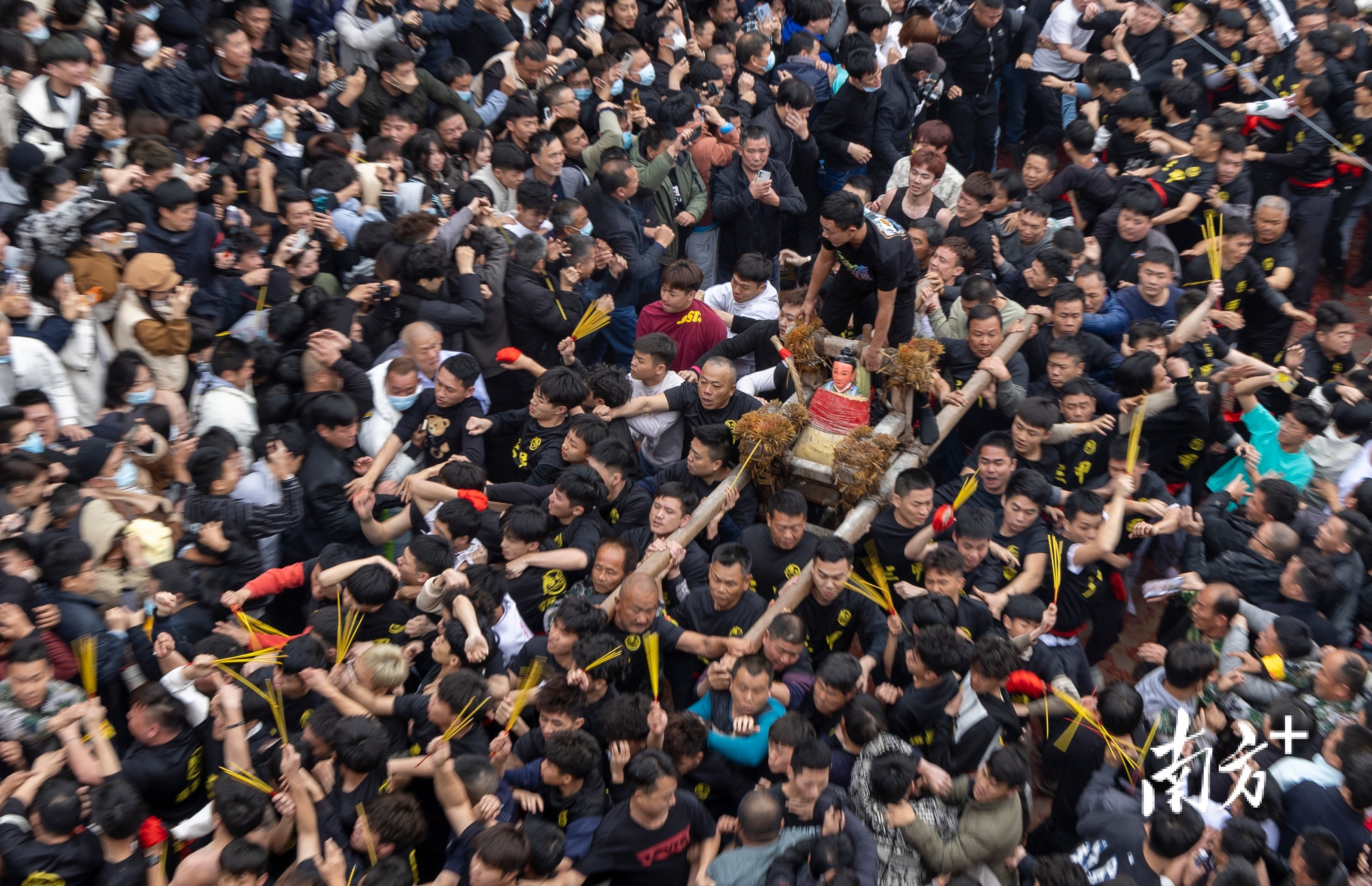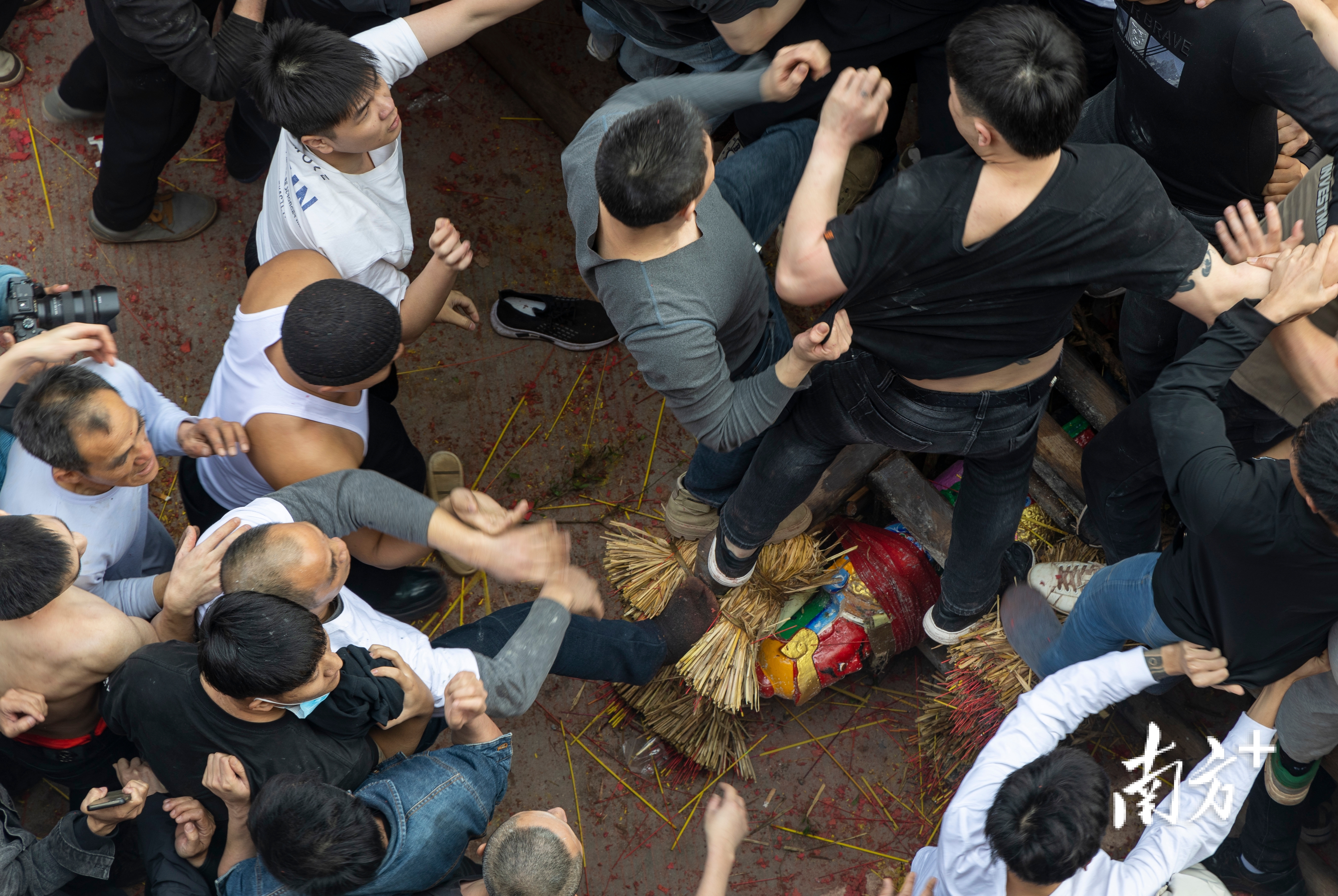 每年轮值的护神壮汉,需提前斋戒沐浴,周身涂满豆油,使抢夺者难以着力。神像以草绳紧缚于轿上,巡游至指定宽阔的“老爷场”时,拖神者方可发起冲锋。活动中,有人持香开道,有人呐喊助威,有人前赴后继。最关键的一条铁律是:“老爷场”里的争夺无论何等激烈,一旦出场,便不可记仇,不可寻衅。