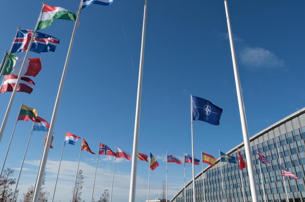 这是2025年11月5日在比利时首都布鲁塞尔拍摄的北约总部大楼外的北约及成员国旗帜。新华社记者张兆卿摄