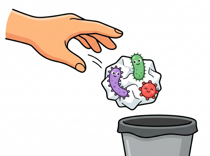 原因也非常简单粗暴:纸巾能吸走水,擦拭时的摩擦力又擦掉了部分细菌,最后水和细菌一起被纸巾打包带进了垃圾桶,没有脏空气参与,也没有气溶胶飞舞。