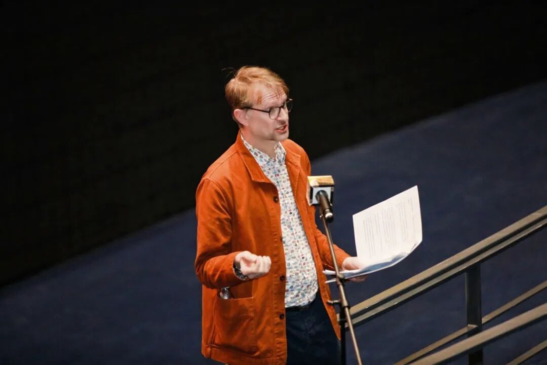 ▲《马到功成》导演马克·布朗罗在上海首映式上发言。 (受访者供图/图)