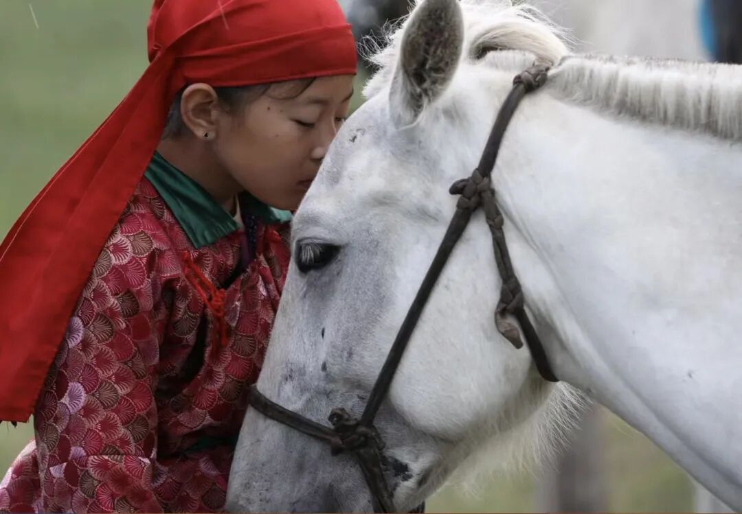 摄制组跟拍了珠拉五十多天,横跨了多个季节,完整记录下兔来出生长大,珠拉第一次跨上兔来背上的马鞍,一人一马配合日益默契,最终一道参加那达慕大会的18公里耐力赛的全过程。夏季的大草原绿意盎然,长满了羽状针茅、羊茅草、苦艾草等马最喜欢的牧草。有些草长得很高,人如果不在马上难以辨别方向。嗒嗒的马蹄踏过蓬松杂乱的草丛,芳草倒伏,马上的小姑娘仿佛飞了起来。蒙古语中,“khiimori”一词表示“精气神”,由khii(风)和mori(马)两个词组合而成。这个词恰如其分地表达出马如何融入蒙古族的文化基因。身为比赛中年龄最小的骑手之一,珠拉超越了一位又一位竞争者——途中半数骑手落马——取得了十几名的成绩。