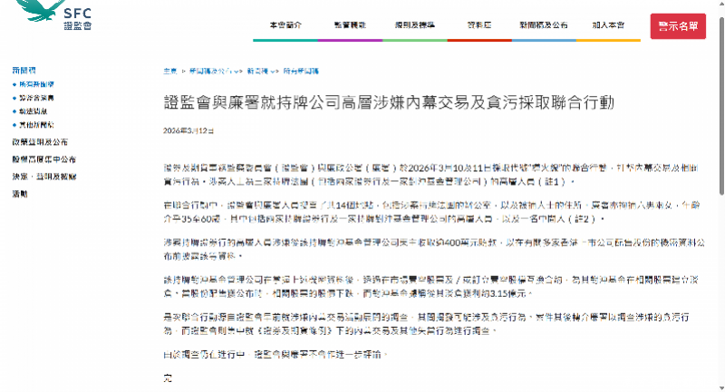 3月12日,香港证监会与香港廉政公署先后发布公告称,证监会与廉政公署于2026年3月10日及11日采取代号“导火线”的联合行动,打击内幕交易及相关贪污行为。涉案人士为三家持牌机构(包括两家证券机构及一家对冲基金管理公司)的高层人员。