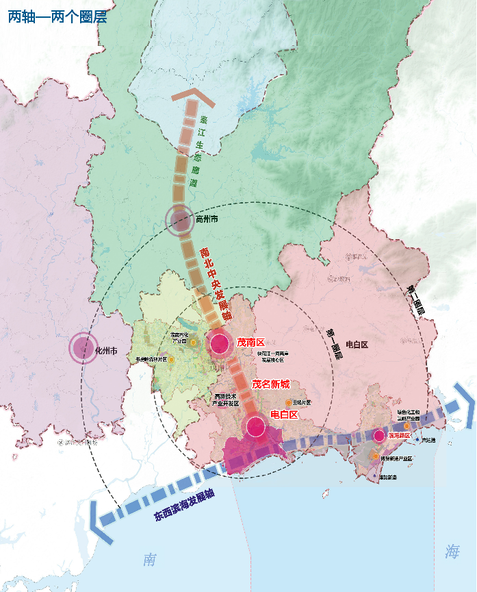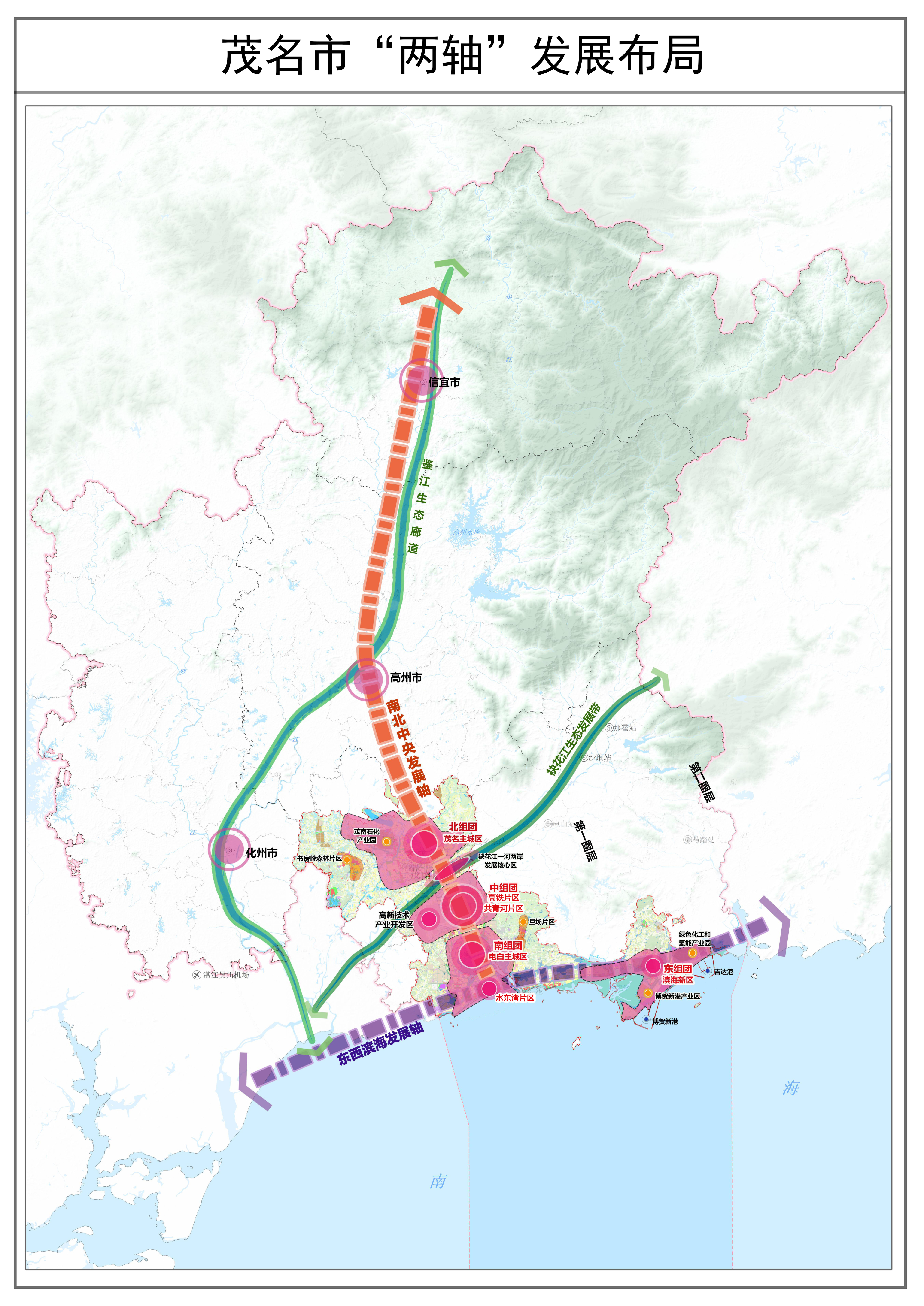 2021年12月,茂名市第十二次党代会报告提出“两轴”的城市发展布局,强调把城市和产业发展重点布局在“两轴”。