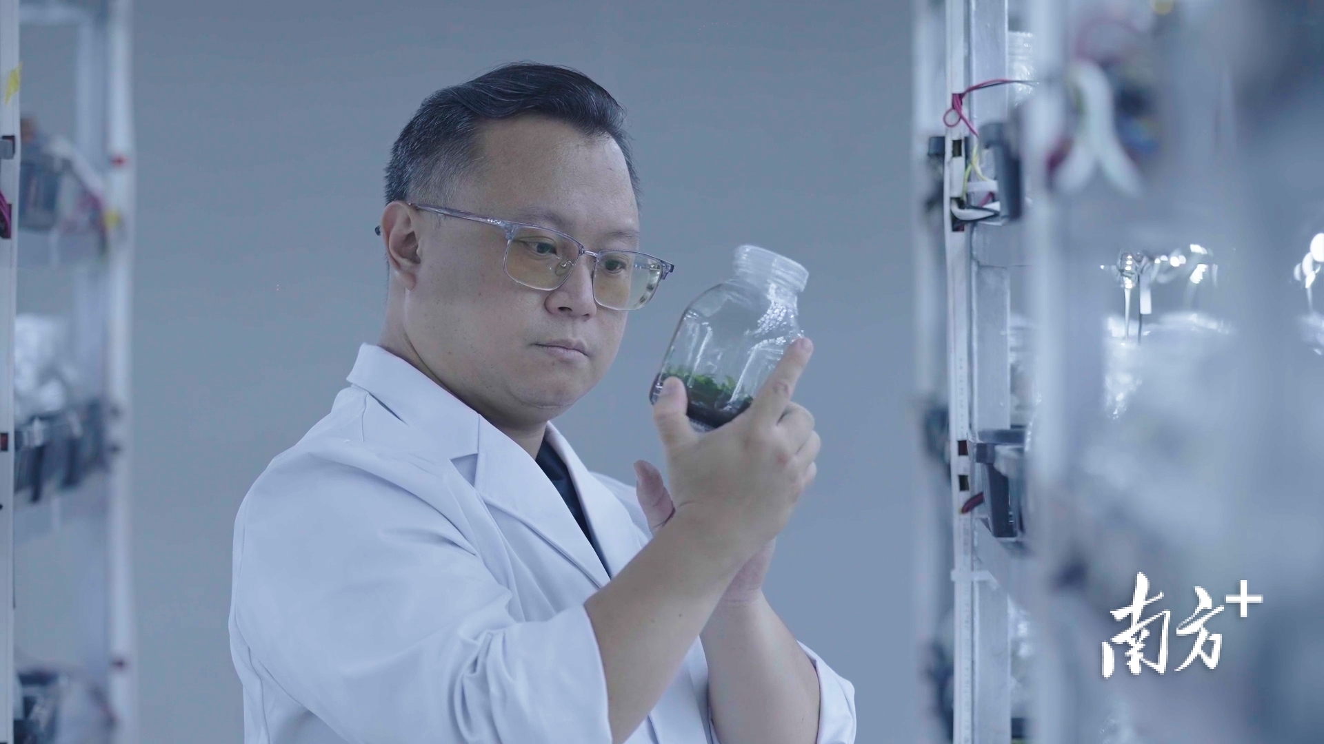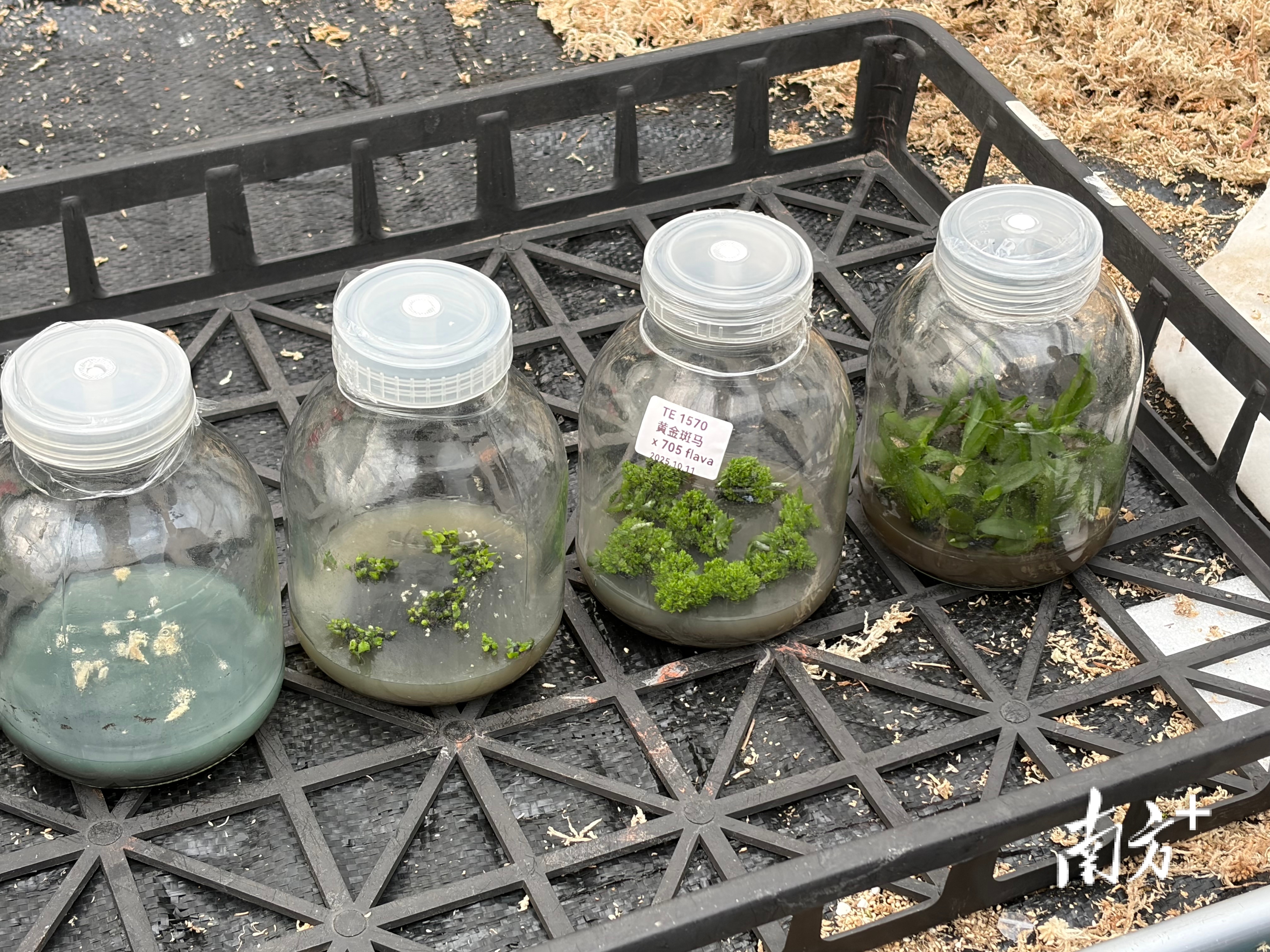 佛山市天俐生物科技有限公司创始人施梃灏认真检视着组培瓶中的幼苗。