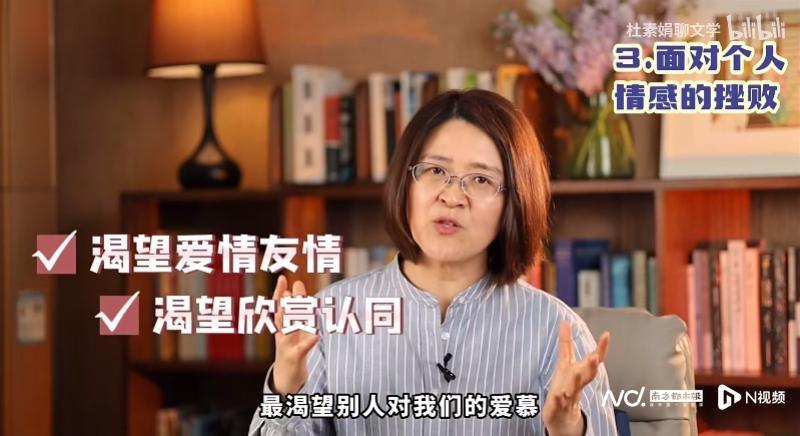 “杜素娟聊文学”:《“二十出头,一事无成”,95后、00后正在承受最痛苦的青春时代?》视频截图说起来,杜素娟对走红感到有些“意外”。最初,她只想安于校园的“一亩三分地”,不愿踏足互联网公共领域。但在学生思祺和史秀雄的积极鼓励下,二人还是尝试合作“文学中的人生进化课”播客,意外收获不少关注。这次与心理学的跨界对谈成为她入局新媒体的起点,更被B站编导陈曦发掘,邀请她入驻成为UP主。平台不仅为她注册账号,还配备团队负责拍摄、剪辑等工作,而此时的她仍处于被动状态,缺乏主动投入的内驱力。