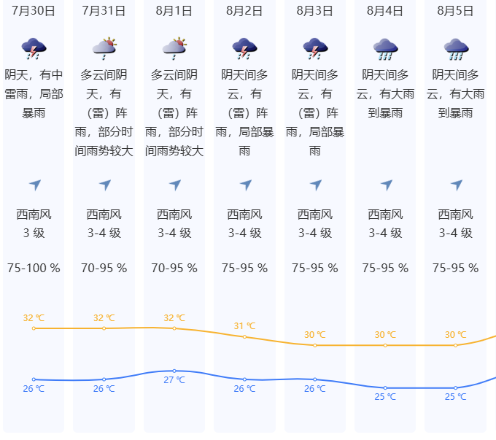 31日-8月1日:有(雷)阵雨,部分时间雨势较大;