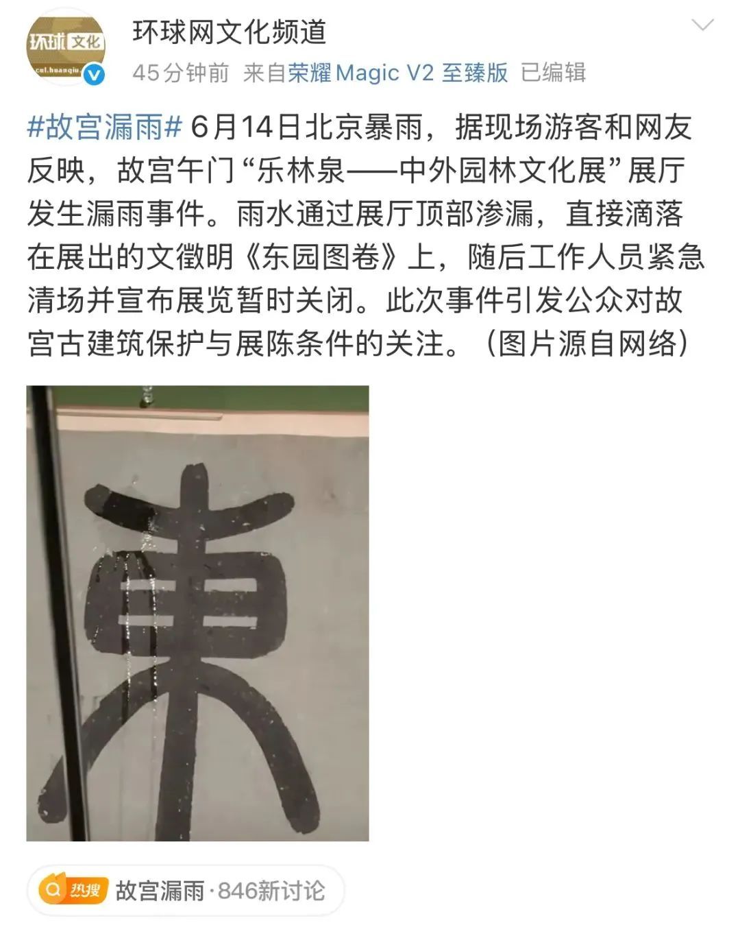 6月14日北京暴雨,据现场游客和网友反映,故宫午门“乐林泉——中外园林文化展”展厅发生漏雨,有展品被渗漏的雨滴淋湿。根据网友发布的视频显示,处于展柜中的《东园图》中的“东”字左部疑似被雨滴淋湿。随后工作人员紧急清场并宣布展览暂时关闭。