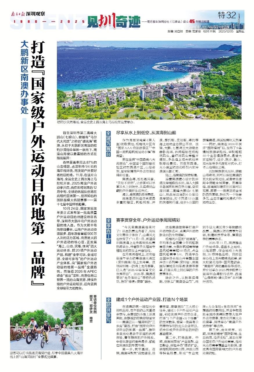 10月24日,国家发展改革委正式发布第一批高质量户外运动目的地建设地区名单,深圳市大鹏半岛户外运动目的地入选。作为大鹏半岛海岸线最长、山海户外运动资源最多,且年游客量超900万人次的活力区域,南澳是大鹏户外运动的核心区,正发展“海上、山地、滨海、休闲”四大运动体系、超20项户外运动产品,构建“全季可玩、全域可游、全龄可参与”的户外运动产业体系,向“国家级户外运动目的地第一品牌”全速扬帆。而随着2026年APEC峰会“官宣”深圳,南澳也将以世界一流的山海资源、持续升级的户外运动场景,迈向更具全球吸引力的舞台。