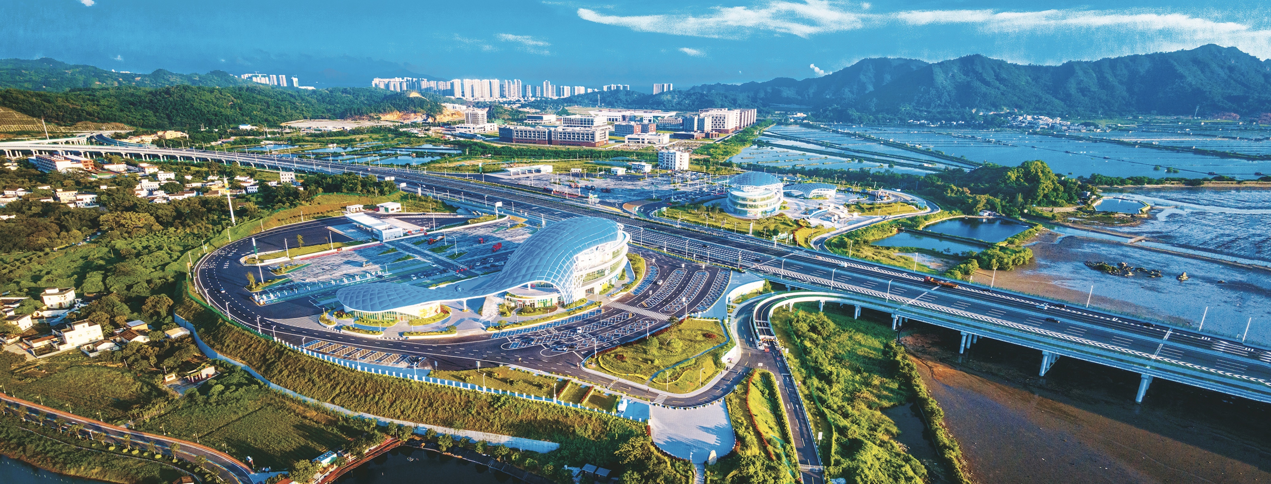 从高空俯瞰,两座外观如同巨型鲸鱼的建筑引人注目,如同在海中破浪前行一般。实际上,这里是紧邻长沙村的汕尾长沙湾服务区,被誉为“广东最美服务区”。