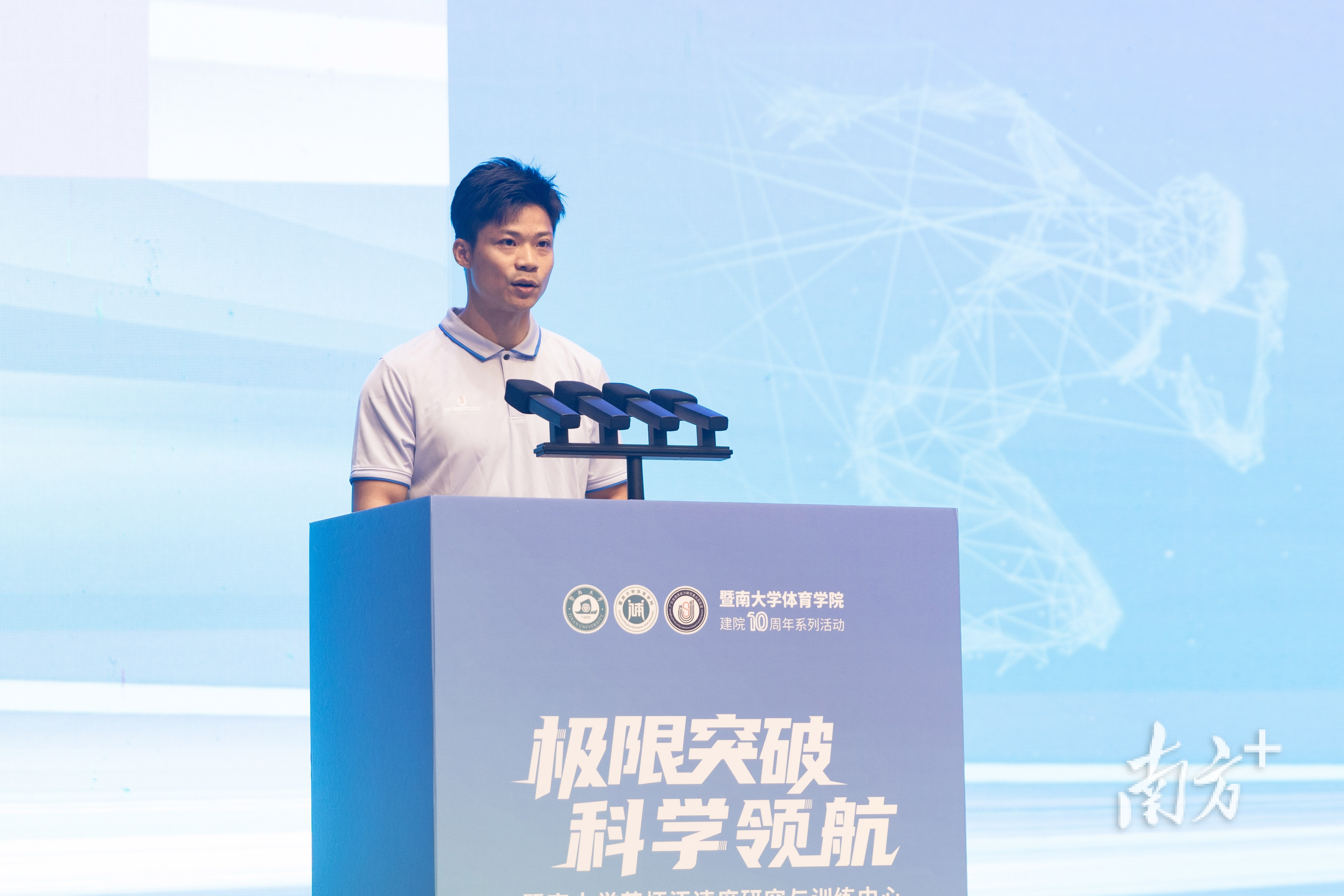 苏炳添在暨南大学苏炳添速度研究与训练中心训练基地启用仪式现场讲话。
