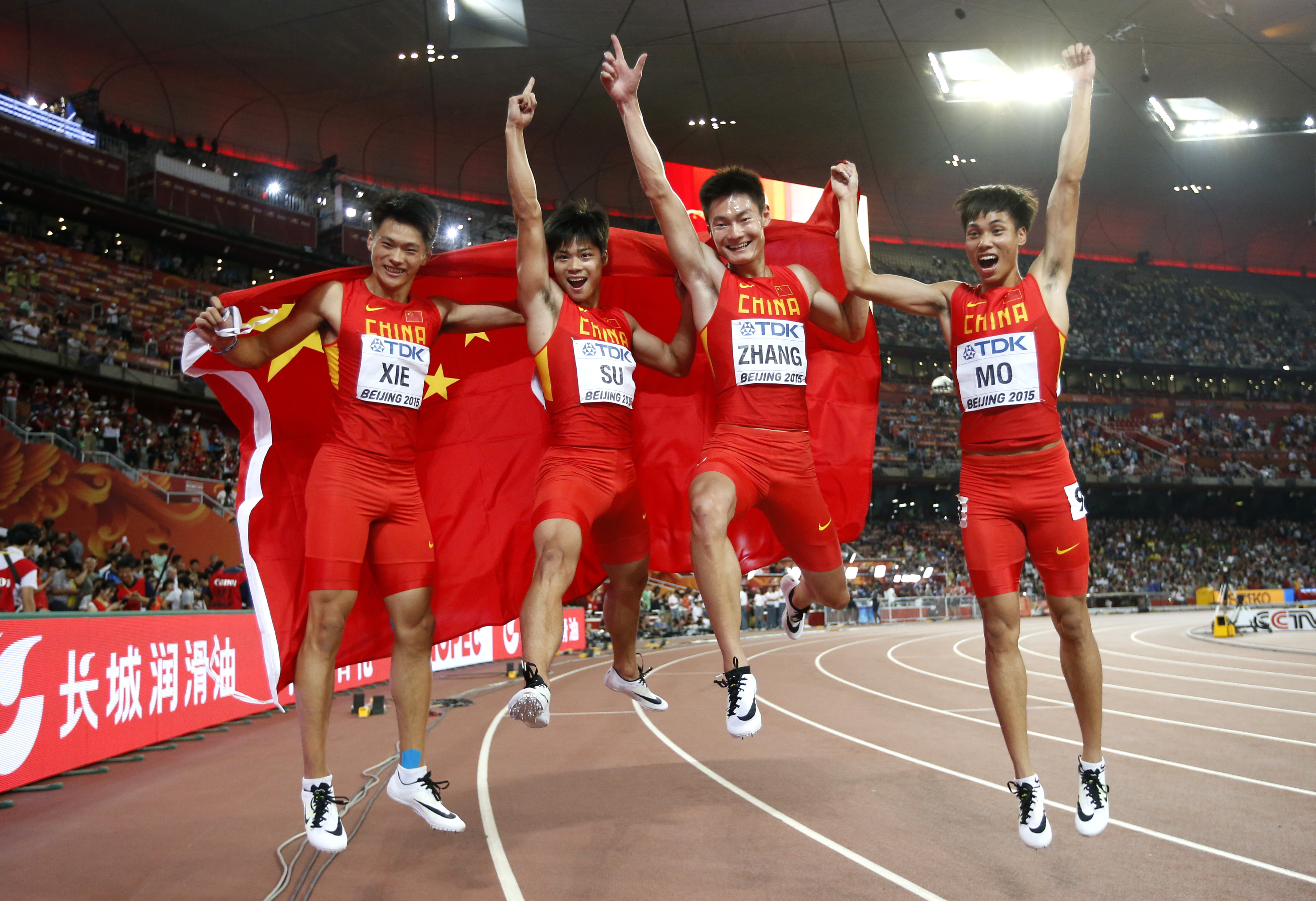 2015年8月29日,谢震业、苏炳添、张培萌和莫有雪(从左至右)在2015年国际田联世界田径锦标赛男子4×100米接力决赛后庆祝,最终中国队以38秒01的成绩获得银牌,创造了中国乃至亚洲在该项目上的最佳战绩。新华社 发