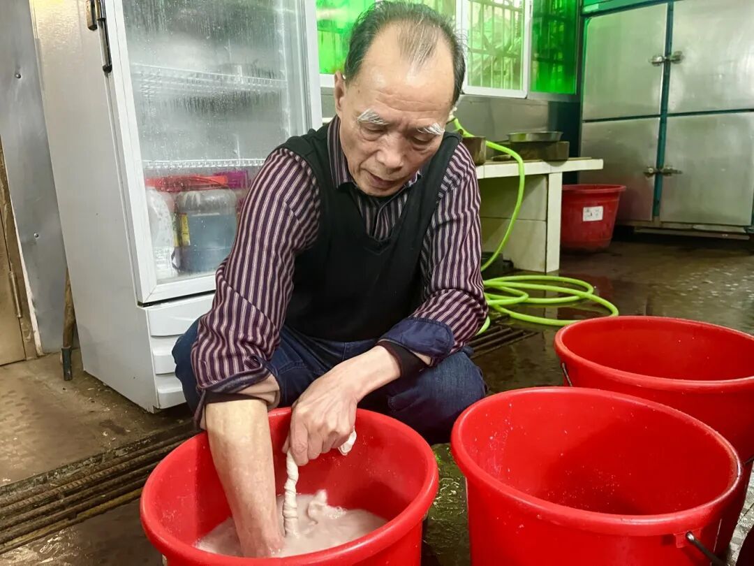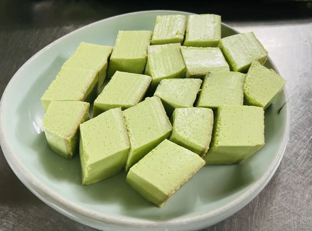 “‘花生韭菜豆腐’是我在2017年,从60、70年代家里老人传承下来、经石磨制成的传统‘花生豆腐’基础上创新研制而成的,因为当时许多客人反馈,‘花生豆腐’虽然嫩滑美味,但灰白色调显得比较单调,让人看着没胃口,于是我便萌生了改变‘花生豆腐’颜色的念头。”冯师傅停下手中的活,语气里满是自豪。