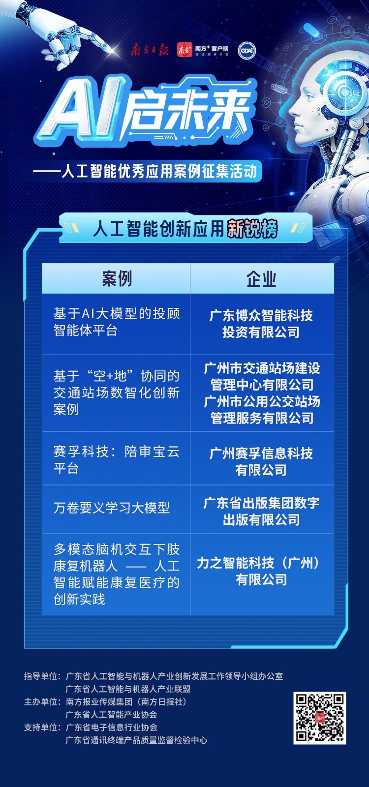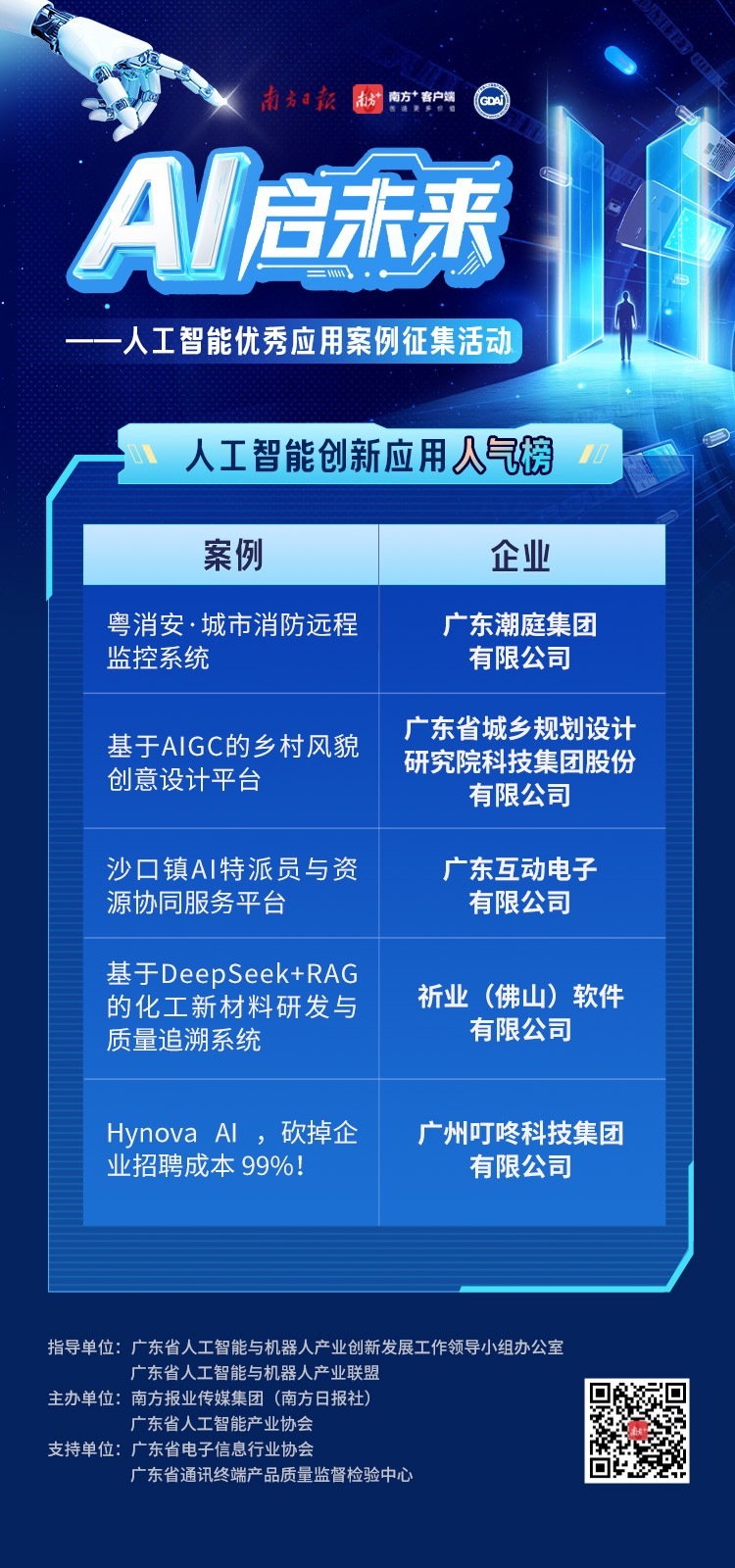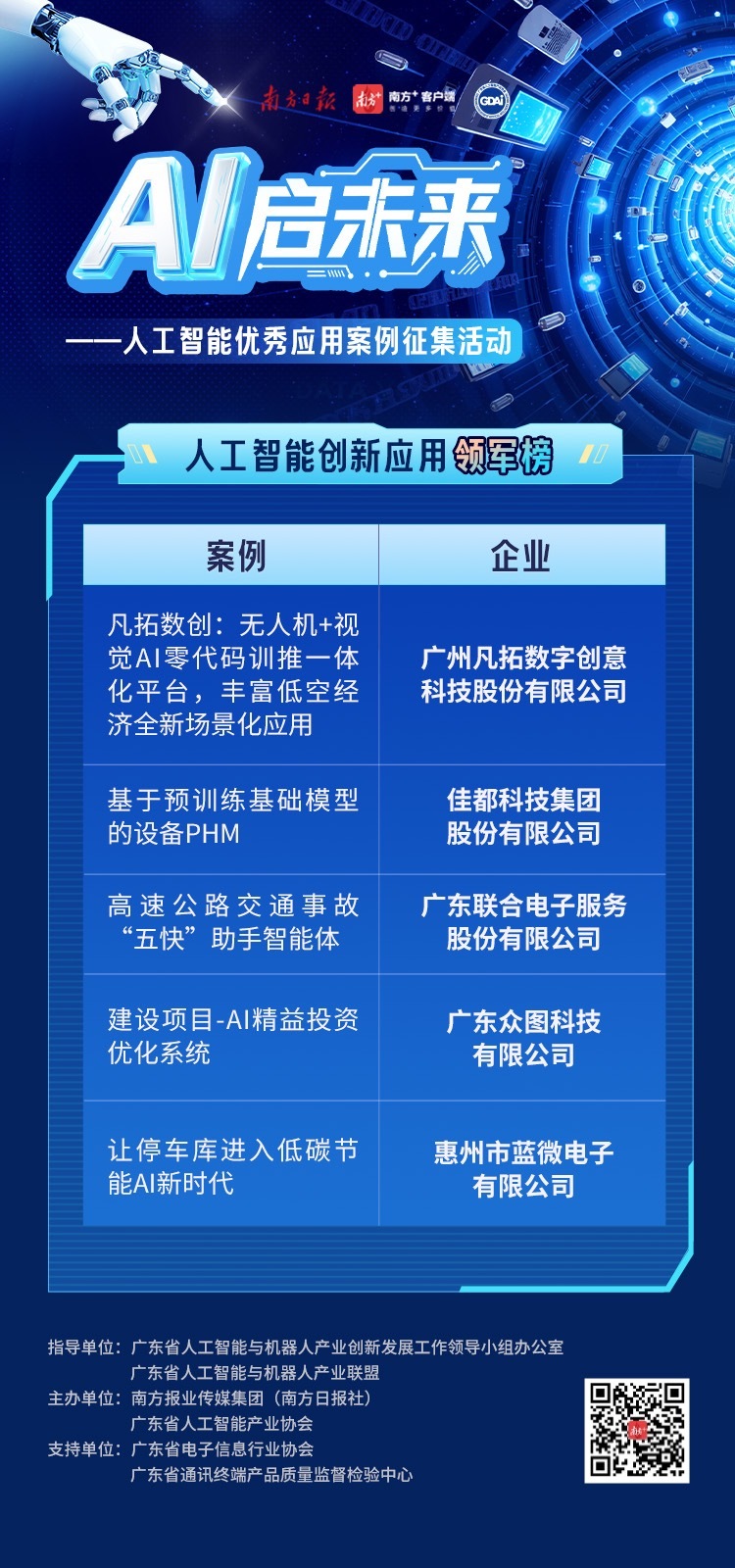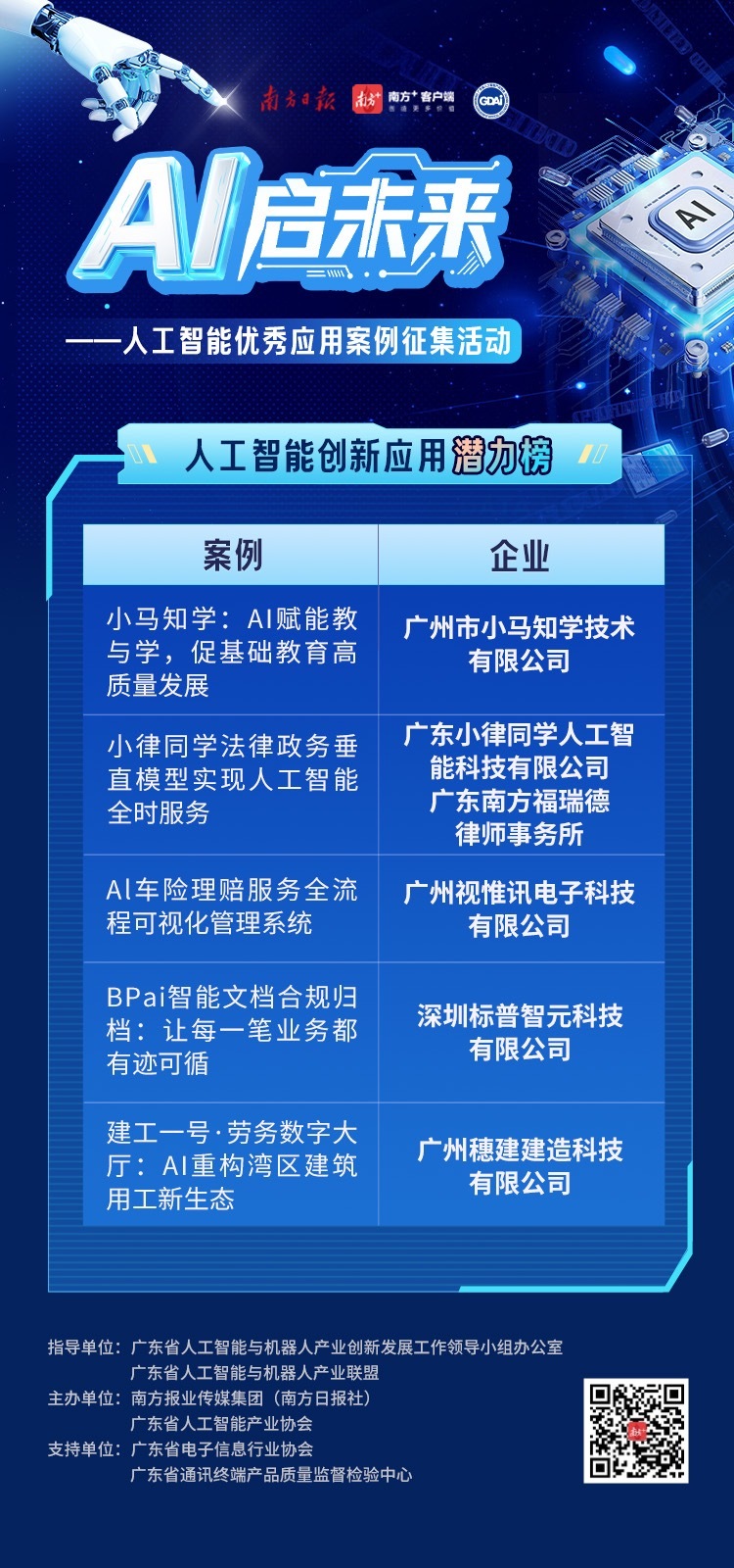 自6月12日起,由广东省人工智能与机器人产业创新发展工作领导小组办公室、广东省人工智能与机器人产业联盟指导,南方报业传媒集团(南方日报社)、广东省人工智能产业协会联合主办的“AI启未来——人工智能优秀应用案例征集活动”迎来企业的踊跃参与,共征集到150多个高质量申报案例,充分展现了人工智能技术在实体经济中的深度渗透与创新活力。