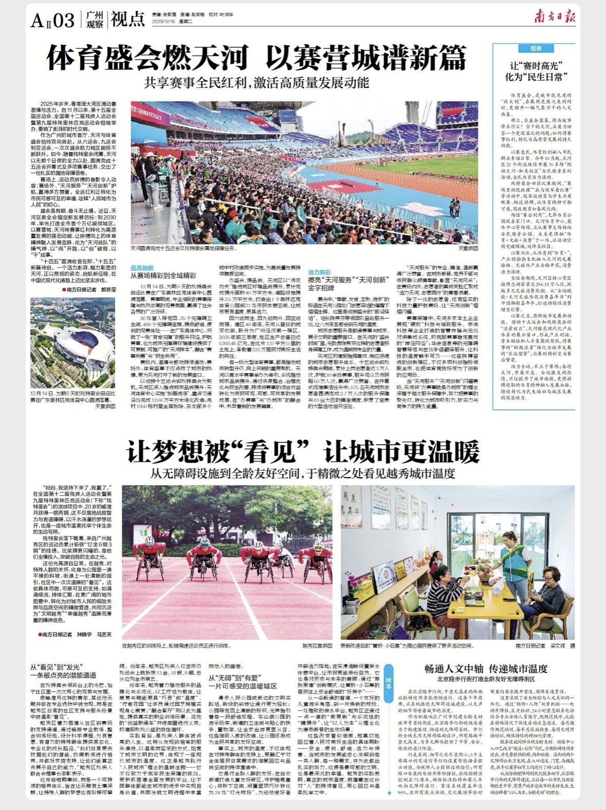 26处盲人导览图、25个无障碍卫生间、406个无障碍座椅,提供舒适、便利的观赛体验……在广东奥体中心,织就了一张“有爱无障”的服务网络,护航赛事,也为城市无障碍环境建设提供了可复制、可推广的“天河样本”,融合“赛事所需”与“民生所用”。